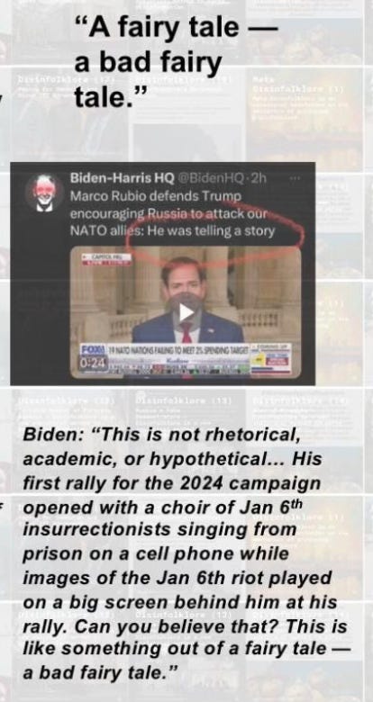 “Trump launched his campaign rally with January 6 insurrectionists singing from prison on cell phone while images of the January 6 riotors played on the big screen behind him at his rally. Can you believe that? This is like something out of a fairy tale bad fairy tale…” (Joe Biden’s Valley Forge speech to mark the anniversary of the Jan 6 Insurrection) 1