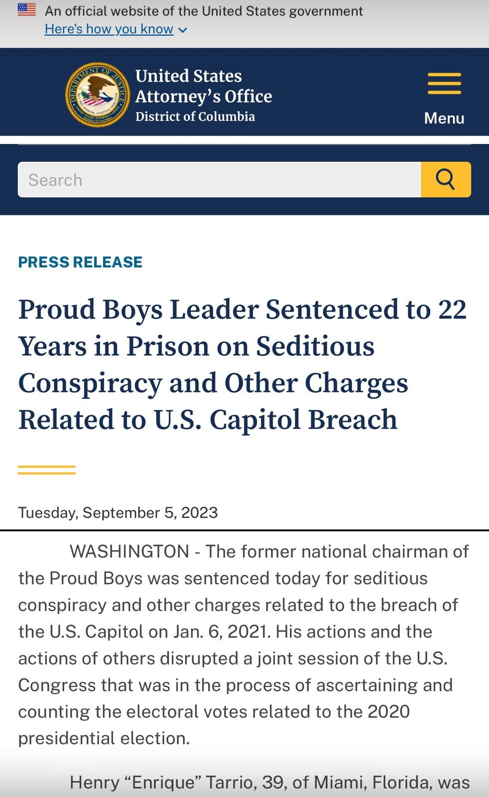 The real conspiracy, according to Donald’s Disinfolklore Galaxy, is Tarrio’s conviction, the Jan 6 insurrectionists’ convictions for conspiracy against the United States. Soon it will be easier to go along with the new reality. Today, U.S. Army Vets are being arrested in the Capitol merely for sitting there in protest against an insurrectionist being president. While on Jan 6 law enforcement officers were murdered and demonstrators sought to kill the vice president and hang Speaker Pelosi.