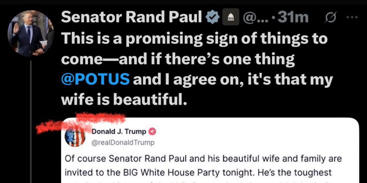 Pointing out this or that person’s hypocrisy is pointless. I point out how Rand Paul swapped everything for an invite to the White House cos he was supposedly the most contrarian of them all. In fact, he’ll even let Donald covet his wife if he’s recognised. Tickle their bellies, stick a fork in them, turn them over, Democrats and Republican legislators no longer hold the power - the coup is complete. No use crying over spilt milk. Adjust your strategies accordingly. Pardoned Proud Boy insurrectionists and MAGA militia been now transmogrified into the conveyors of Reich. They are now enforcing the death of the first republic.