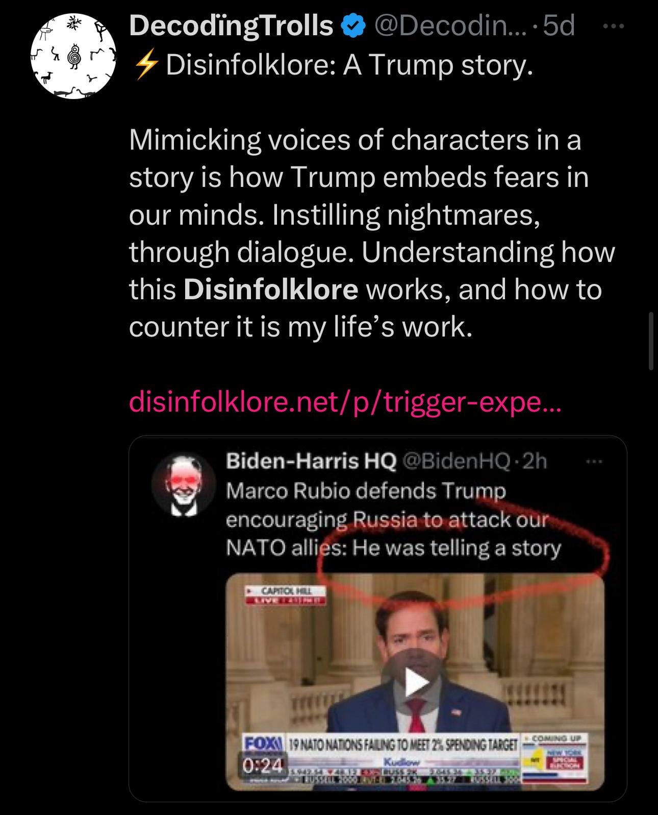 In a week when Trump used a folksy account of a conversation that never happened with a leader of a great European power to communicate that he wouldn’t defend NATO states unless they paid their ‘dues,’ the importance of communicating a Disinfolklore perspective has never been greater.