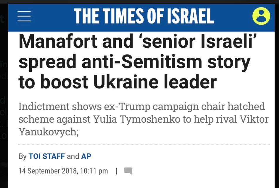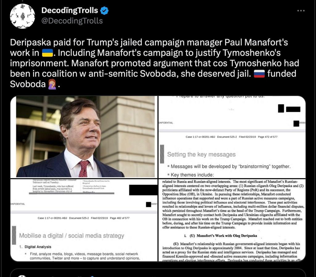 Svoboda was a stock character in pro-Russia Disinfolklore operations in Ukraine. Its stock-in-trade anti-semitism had been used by the former US president’s jailed campaign manager Paul Manafort. Manafort had needed a way to annihilate sympathy in the west for the former Ukrainian prime minister Rapunzel Julia Tymoshenko who Manafort’s then boss - the impeached ex-president of Ukraine - had imprisoned in a tower.