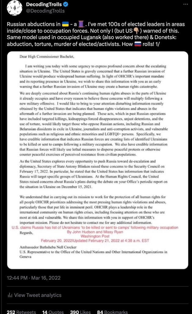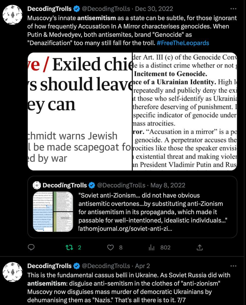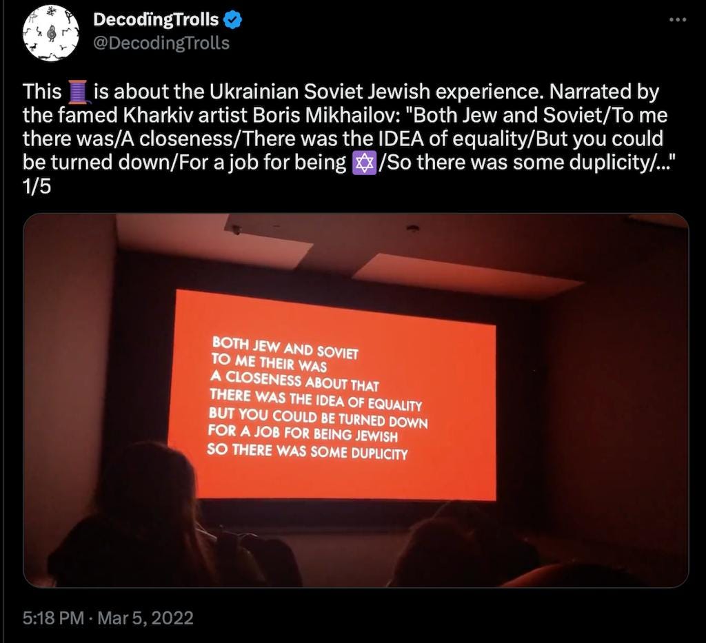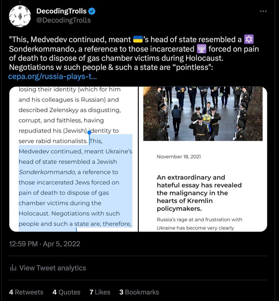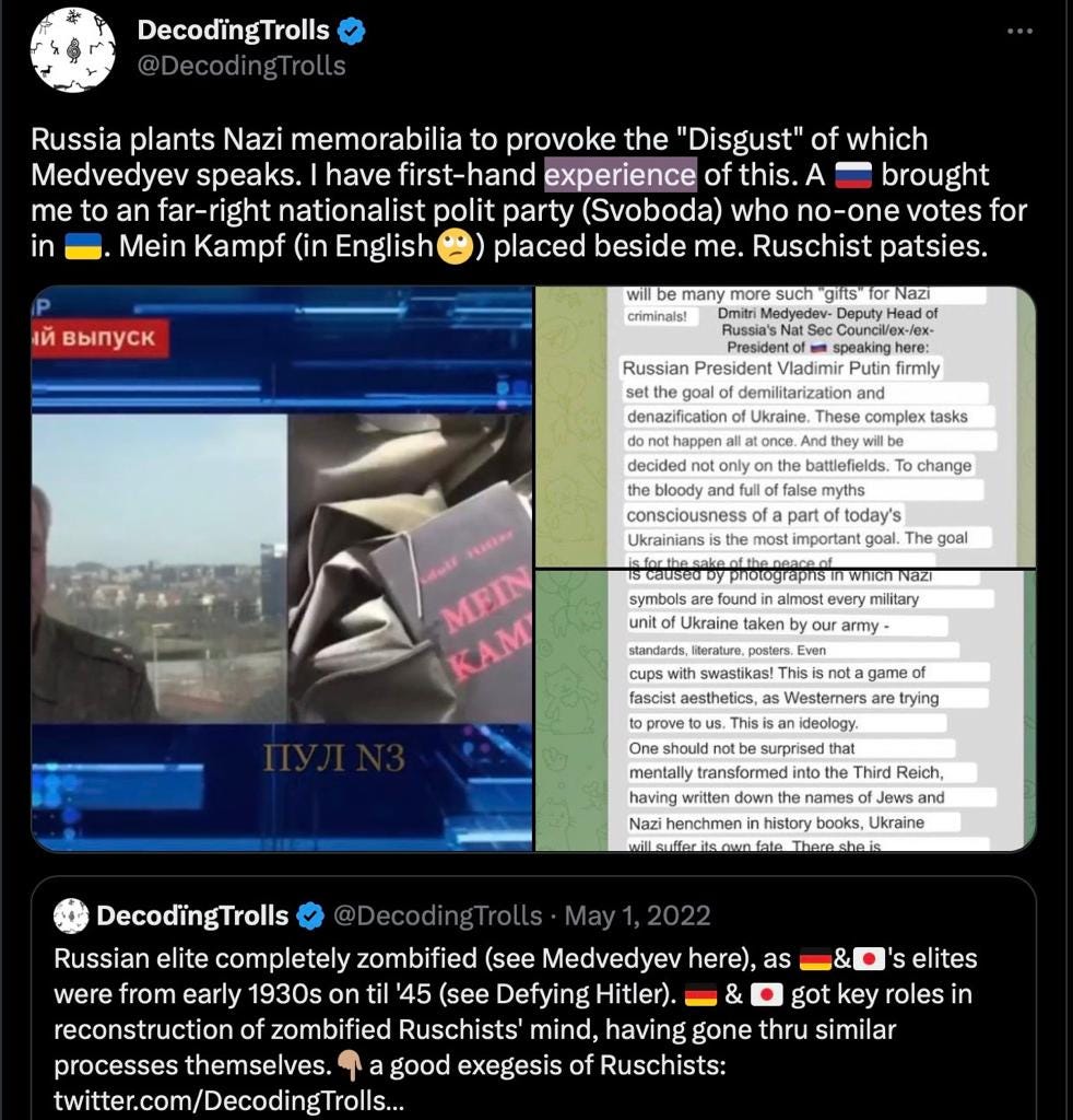 In parsing Russian Disinfolklore and indeed in spotting it, any reference to anti-semitism in Ukraine or Nazis, in any context related to Russia’s genocidal war against Ukrainians, immediately identifies this as Russian Disinfolklore.