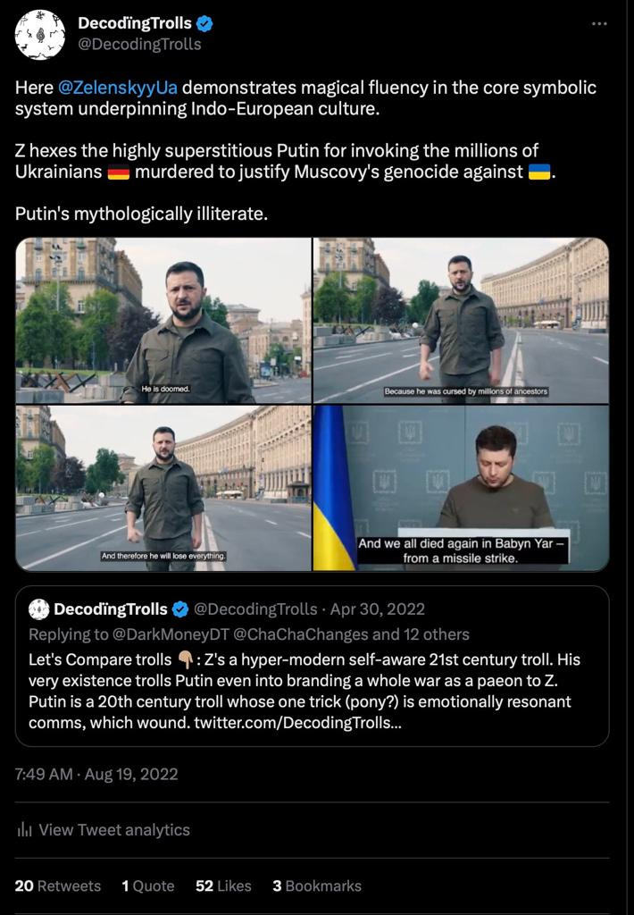 There is one weapon you can use against Russian Disinfolklore: War Magic. President Zelenskyy has mastered the art of enspelling his enemies and the enemy of all Ukrainians. We will refer again and again in future Disinfolklore episodes to President Zelenskyy’s mastery of magic (trolling and emotionally resonant manipulation is a form of magic). But, for now, I shall leave you with this taster. It’s from a video released by President Zelenskyy in May 2022. President is referring to Putin, but he doesn’t use his name: