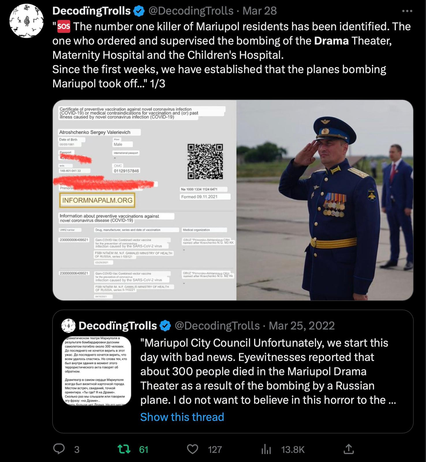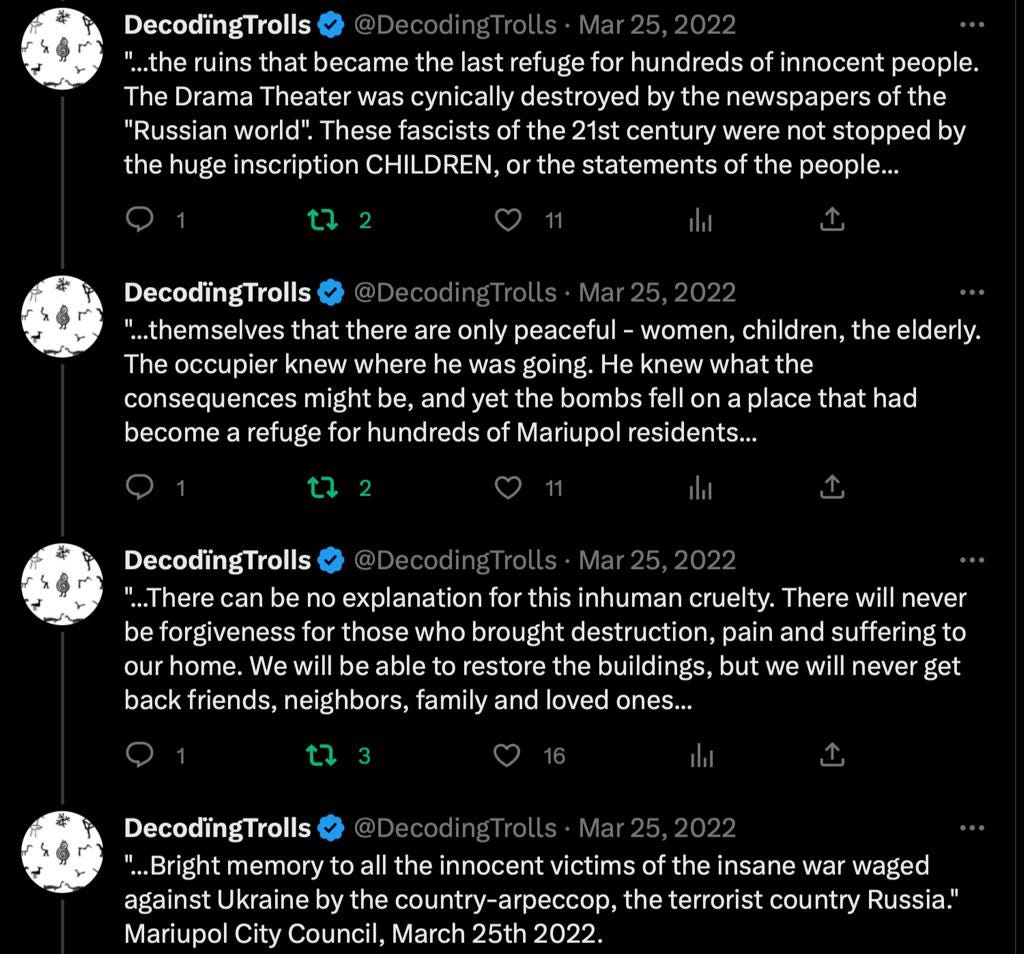 There is a touch of magic to Russian Disinfolklore. Let’s take a Russian language speaking Ukrainian from the mainly Russian language speaking Ukrainian city of Mariupol. Russia has killed around one hundred thousand Ukrainians in Mariupol since February 24th 2022. Let’s imagine an archetypal female Ukrainian in Mariupol. In Russian Disinfolklore she and her child were being held captive by Ukrainian Nazis. She was the reason why Russia acted on its messianic impulse to “save” Russian-speaking Ukrainians from the non-existent Nazis.