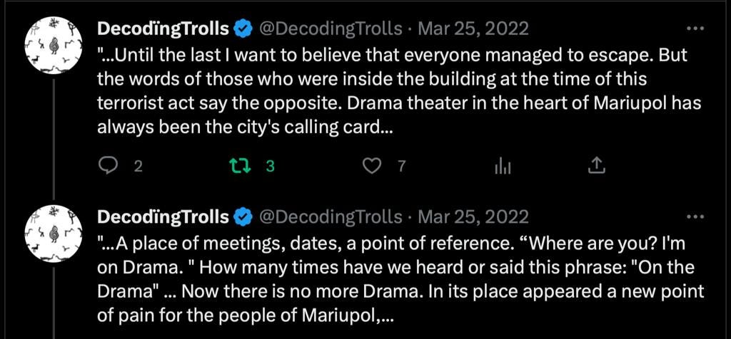 So we return to this archetype from Mariupol. According to Russian Disinfolklore on the 20th of March 2022 we have an Inner Realm native Russian language speaking Ukrainian in need of liberation by Russia. She is hurrying with her daughter to Drama Theatre in Mariupol to shelter from Russian shelling. Drama Theatre has been a central character in Mariupol’s community life for generations - it is more than a mere theatre. Perhaps our native Russian language speaking Ukrainian had met her partner at Drama?! She will have certainly brought her daughter to performances of Swan Lake and other folklore-themed theatrical performances in the theatre. Generations of Mariupol dwellers met at Drama for tea, dates, just to hang out, and to be entertained.