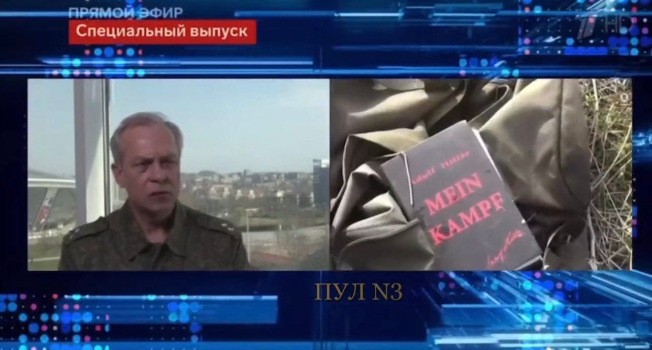 The imagery is clumsy and bizarre in these frames from Russian Disinfolklore television - a copy of Mein Kampf is inserted into a “news” item about the capture of a Ukrainian soldier: