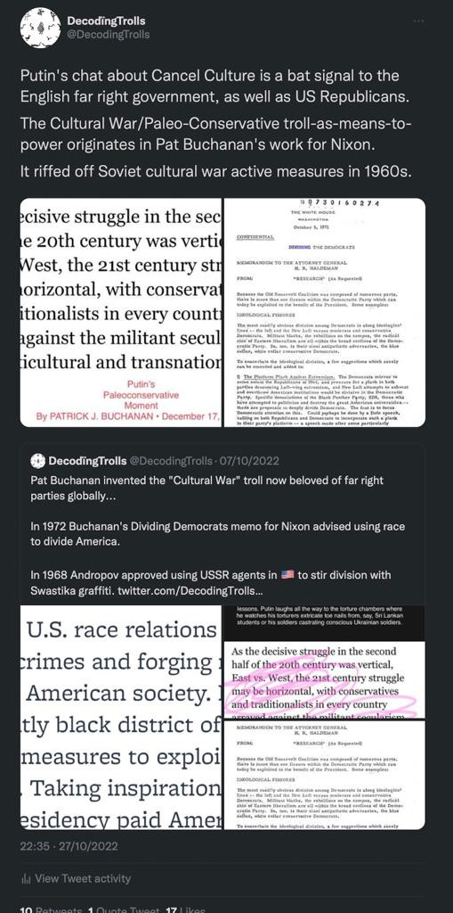 Authoritarians and their followers promote the idea that their authoritarian bent of mind is akin to an ethnicity that is at war (they love war metaphors) against an Other - “Liberals",” “Democrats,” “LGBTIQ+ equality,” “Wokeness,” “Human Rights lawyers,” “Black Lives Matter,” or, as former Nixon to Trump adviser Pat Buchanan (the man who created the Cultural War troll in 1991) put it in his 2013 paean to Ruschist dictator Putin: