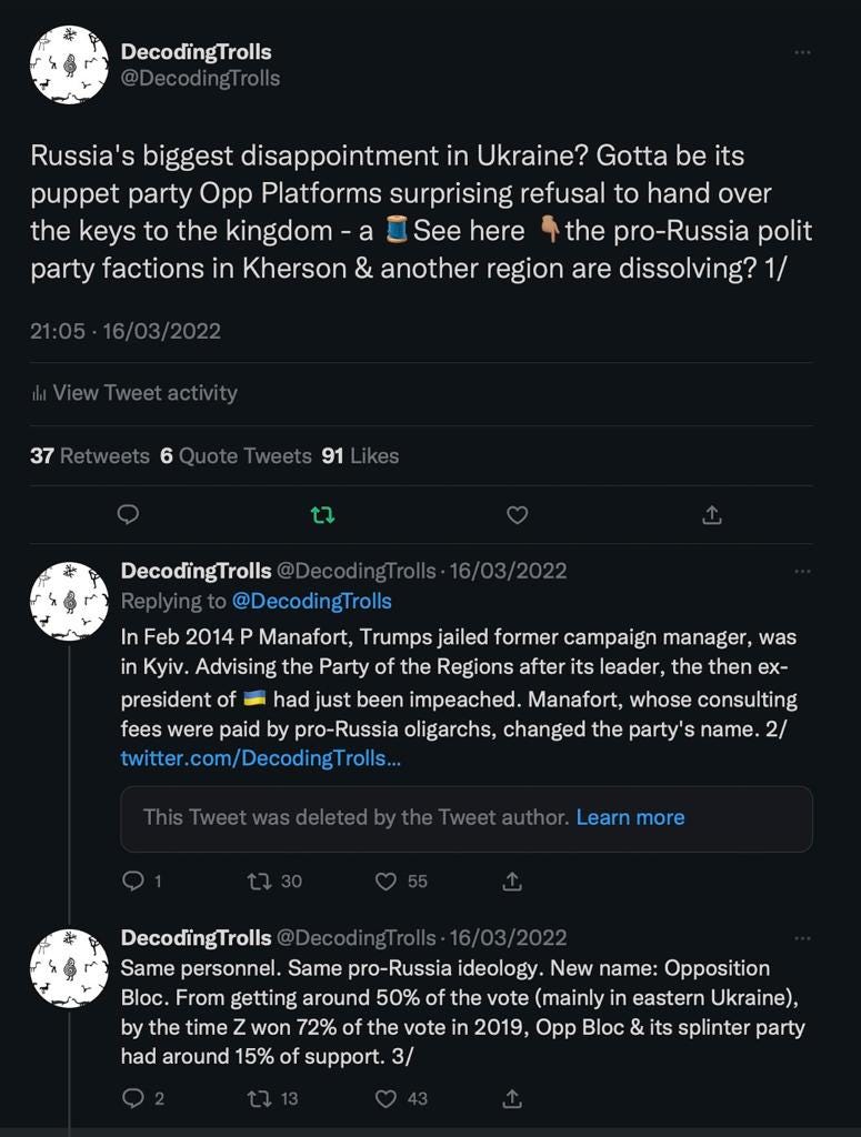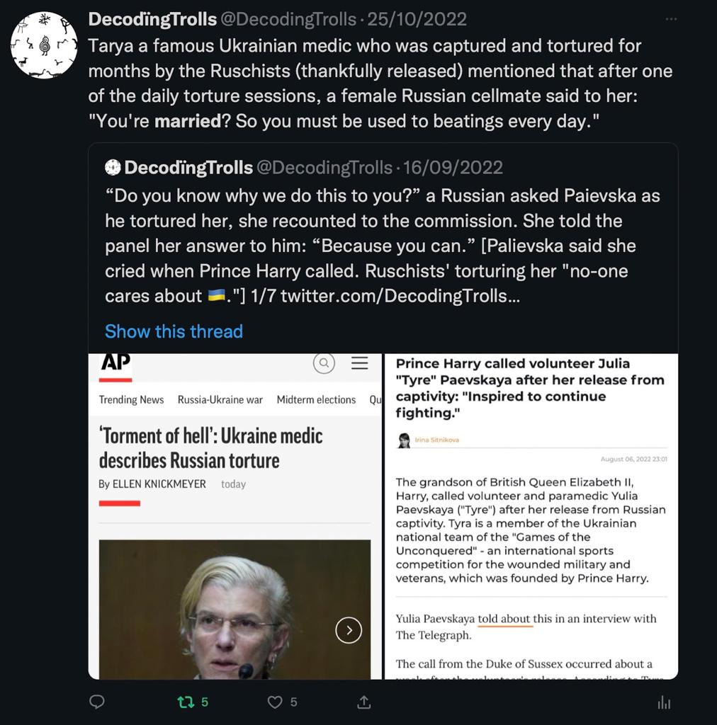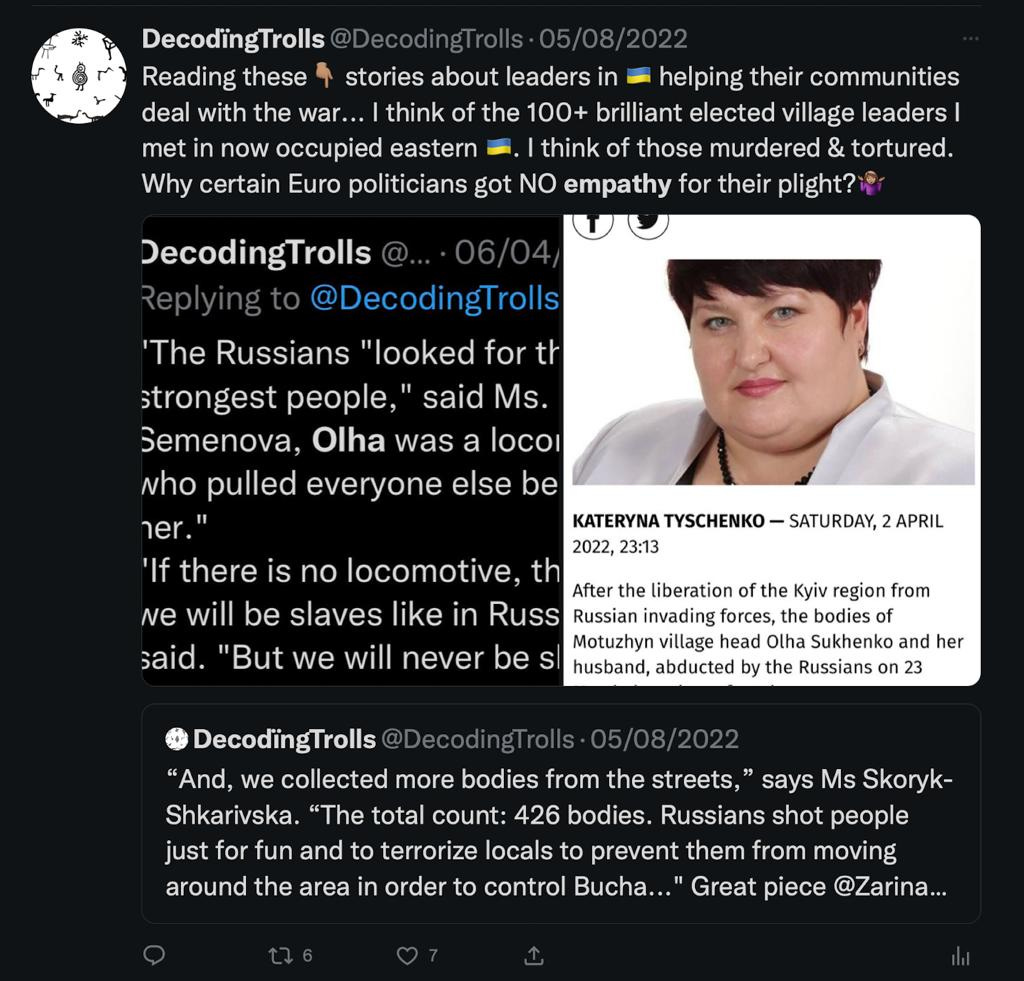 We showed in the Cut Into Tiny Pieces episode of Disinfolklore that this motif was present in Russian Disinfolklore in occupied Ukraine from earliest times. We also mentioned that its obvious stereotypical resonances are what helped us to discern the artificiality of the story. The raw primal emotion of protecting the woman and her underage daughter that the story seemed set up to evoke was, for us, even then, long before we discovered the Code of Positive Trolls, Positive Trolling or Decoding Trolls, a marker of its fakeness. “Me thinks the [Russian Disinfolklorist’s invention of a] lady doth protest too much” and all that.