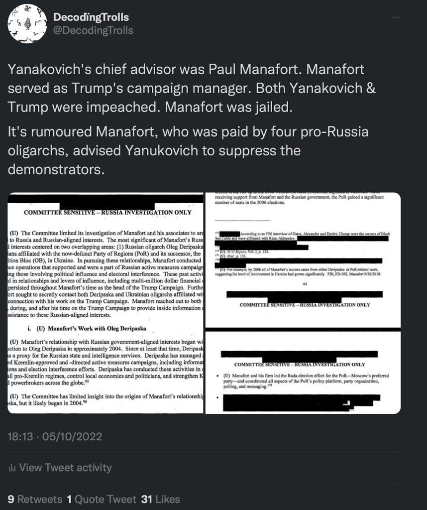 Ruschists, authoritarians, some oligarchs, and right-wing politicians all over the world have realised the power of generating polarisation in society over issues related to what used to be called “Family Values”. The impeached former US President Trump’s jailed campaign manager Paul Manafort was responsible for running several presidential campaigns for Ukraine’s impeached president Yanukovich. The fees for Manafort’s work in Ukraine, according to the US Government’s Mueller Report on ties between Trump’s campaign and the Russian interference in the 2016 US Presidential election, were paid for by Kremlin-supported oligarchs. Manafort’s different campaigns in Ukraine played up cultural divisions between the east and western parts of Ukraine.