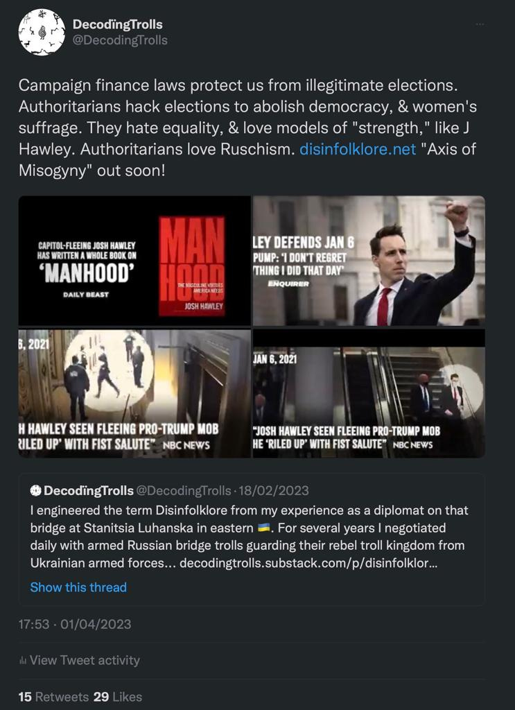 So we cannot be complacent about the scourge of authoritarianism, misogyny and the cynical manipulation of those high on the Right-Wing Authoritarian psych scale whether it is in Russian Disinfolklore, or other forms of anti-democratic manipulation. Understanding what makes these people tick enables us to design and propagate more effective Counter Disinfolklore.