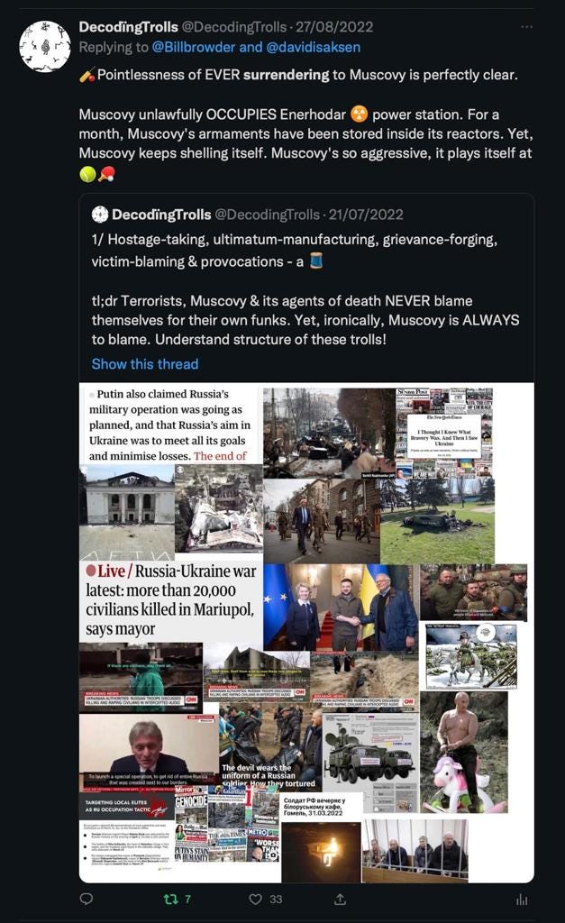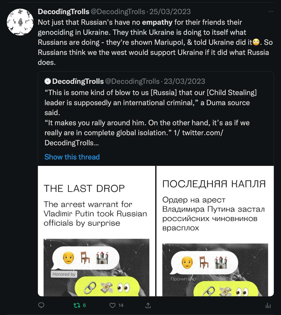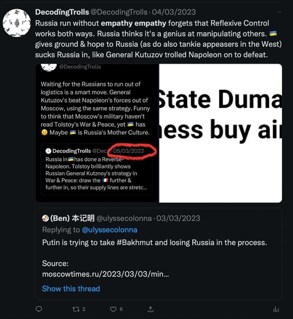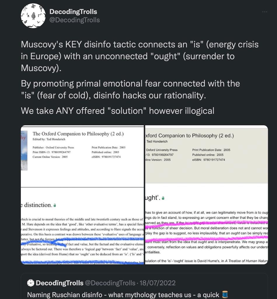 So, having predicted empathetically how we will react, the Russian Disinfolklorist will design a stimulus that will provoke us to act in a certain way. Often such operations are quite primitive. They will provoke a primal emotion (for example, fear) by, for example, threatening a nuclear war. Then they will offer a “solution” such as “Stop Arming Ukraine!” which the innocent target will adopt as a policy without even rationally assessing it.