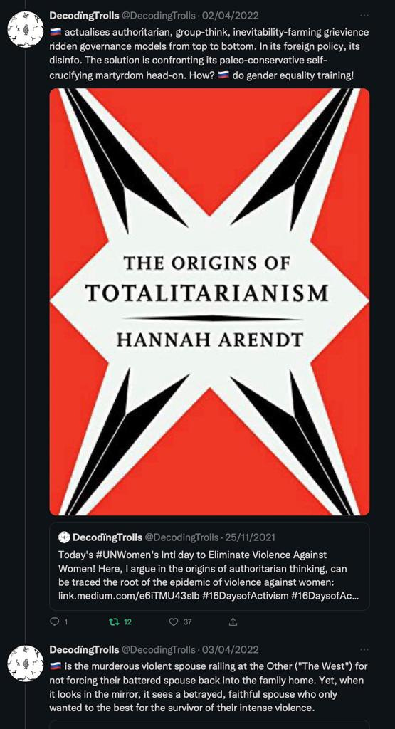 Russia is, naturally, part of the Axis of Misogyny, along with the Iranian regime, as well as the Chinese Communist Party. We refer again to one of the core themes of Disinfolklore: how the micro (in this case, the authoritarian-minded individual) and the macro (the groups, political parties and countries authoritarian-minded individuals participate in designing) interact. Authoritarians will never design a society in which they can prosper in tandem with those of us who believe in equality of opportunity, human rights protected by law, and democracy. Like, the Nazi party, authoritarians see an opportunity in a democracy to gain power only to abolish power. It’s no coincidence that in setting out its war aim in Ukraine, Russia chose the idea of “denazification.”