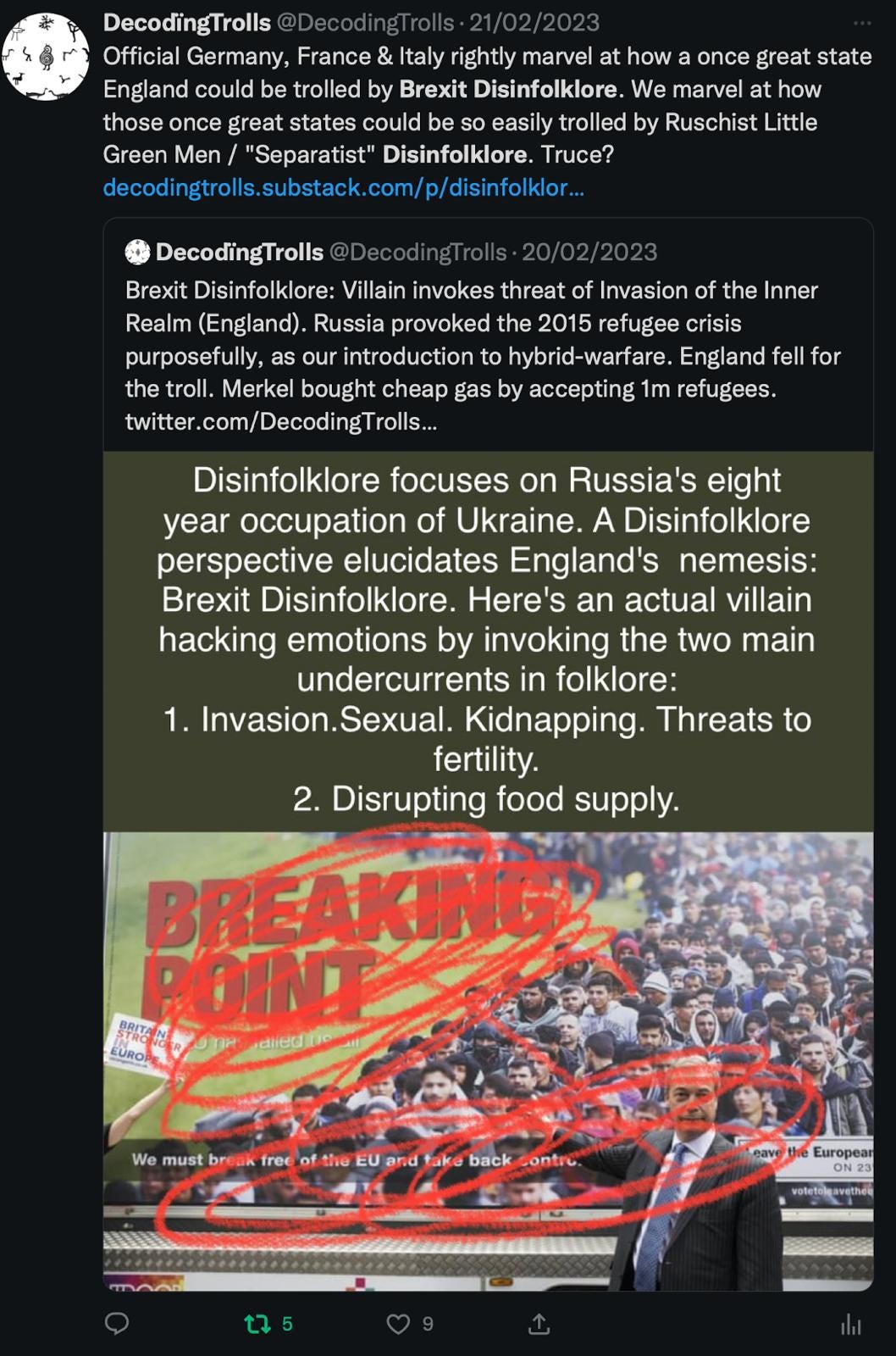 Interestingly, immanent in Russian Disinfolklore, also, are the values Russian Disinfolklorists believe its intended audience share. The Russian Disinfolklorist attempts to empathise with their target audience so that they can troll their emotions with trolls that provoke the receiver to act in certain ways.