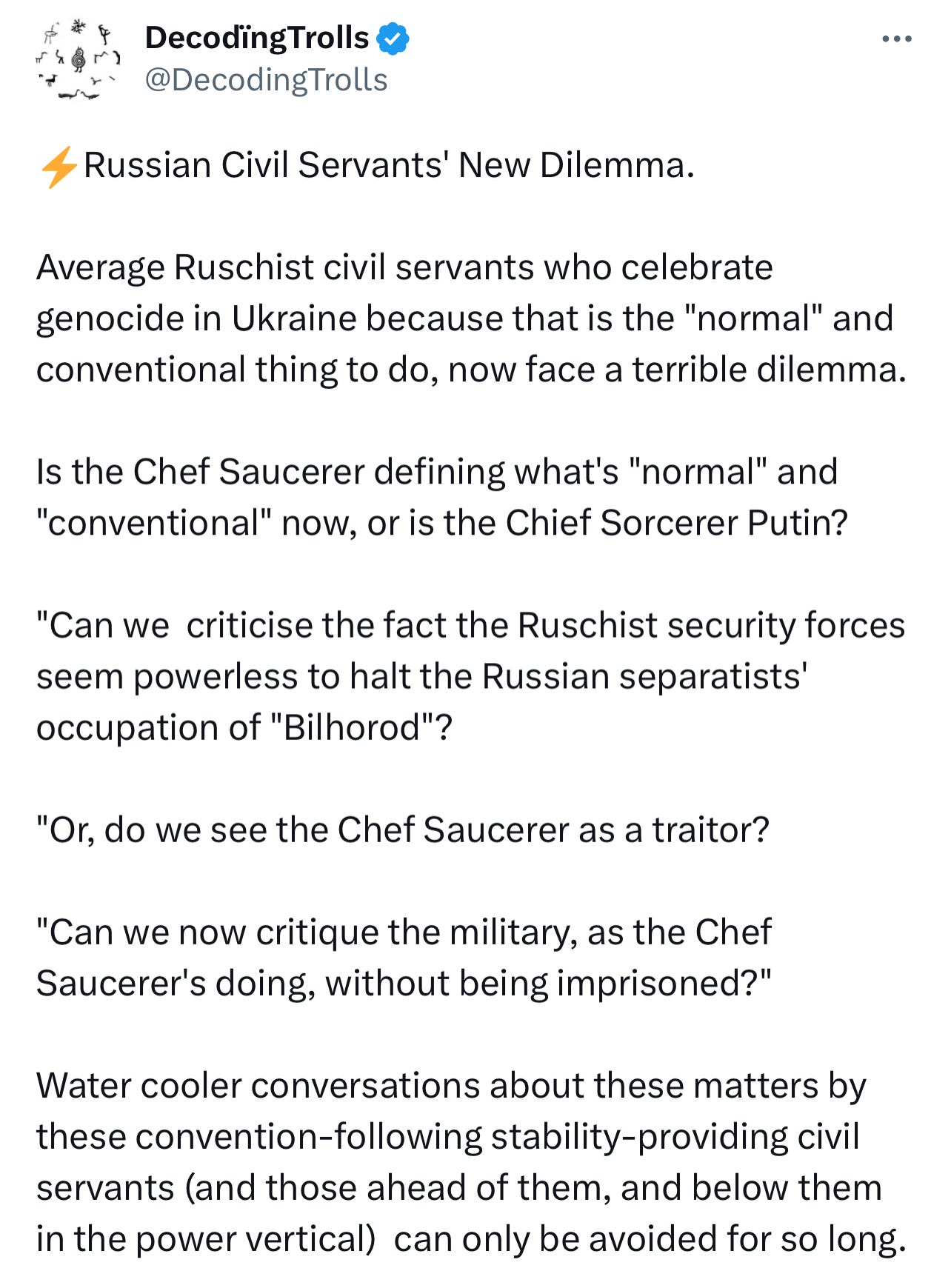 So this means everyone in the Russian power vertical from Putin down to the merest tea deliverer in an FSB office or State troll farm better keep on the Chef Saucerer's good side (see the Civil Servant's New Dilemma: