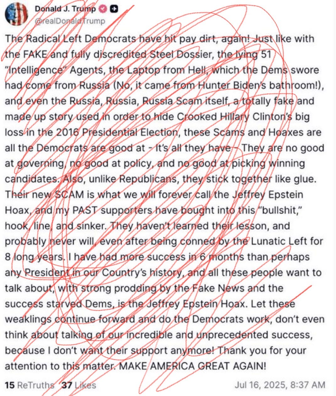 Here Donald manages to fit in most of his go-to hypnotic trigger phrases. It could be written by A.I. trained on Joyce’s masterpiece Ulysses. The trick is: you do so many voices in one text no-one knows which to focus on: