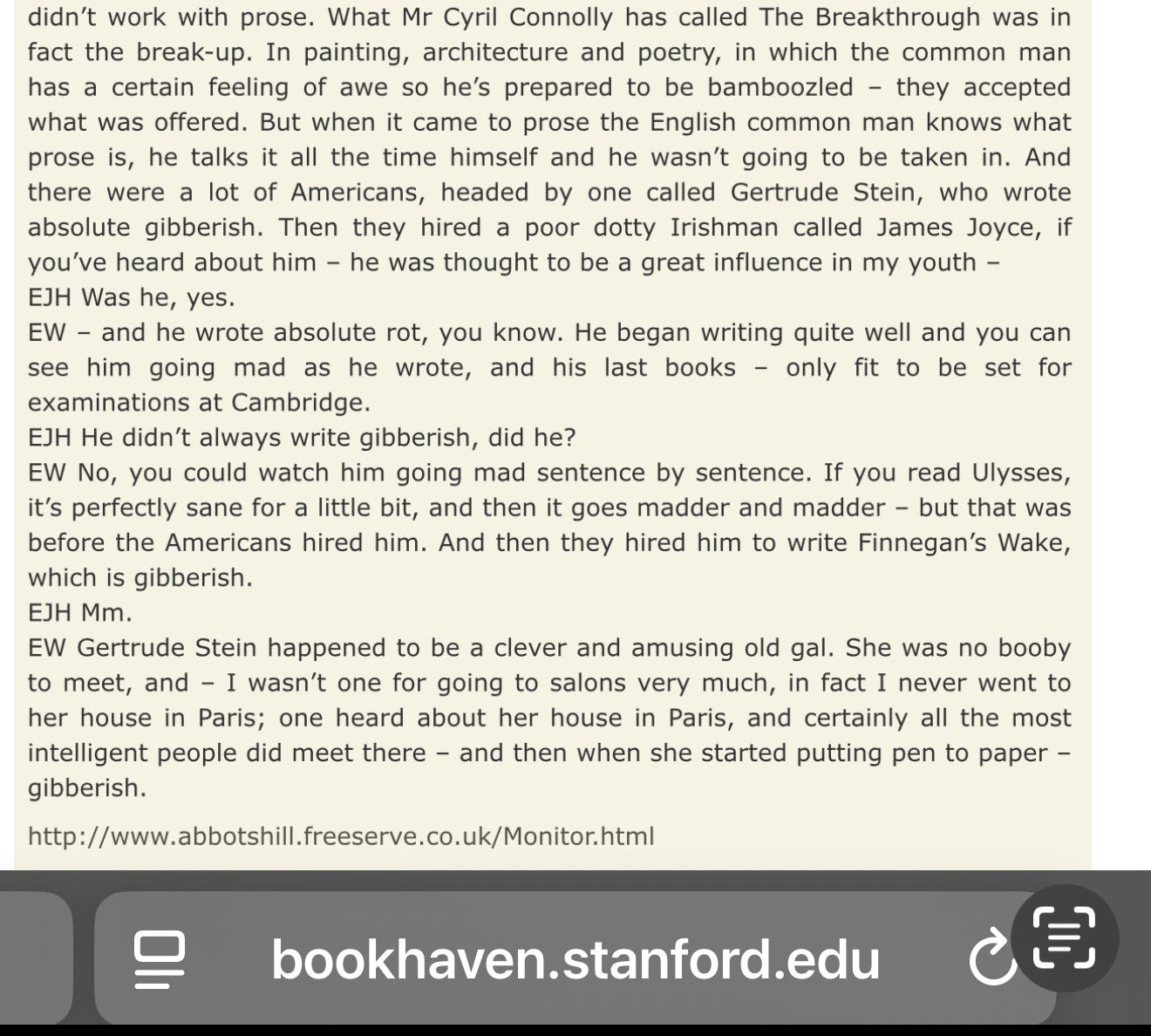 Another of the great twentieth century novelists, Evelyn Waugh, had no time for Joyce’s stream of consciousness text. Here in a 1960s interview Waugh, anticipating how many might evaluate Donald or Newsom’s tweets, characterises Joyce’s technique as “gibberish” and “absolute rot.”