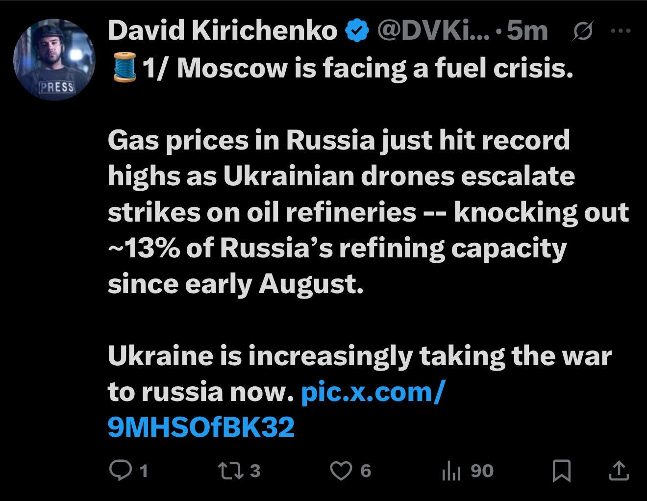 As part of its independence celebration this month Ukraine has so far eradicated ~13% of Russia’s fossil fuel refinery capacity. Ukraine has taken out 9 Ruschist refineries in twenty-one days. Awesome.