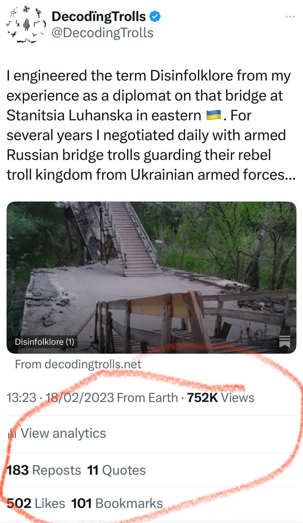 My first Tweet on Disinfolklore garnered 754,000 views, 177 reposts, 509 likes, and 102 bookmarks: https://x.com/decodingtrolls/status/1626875001461784577?s=46.