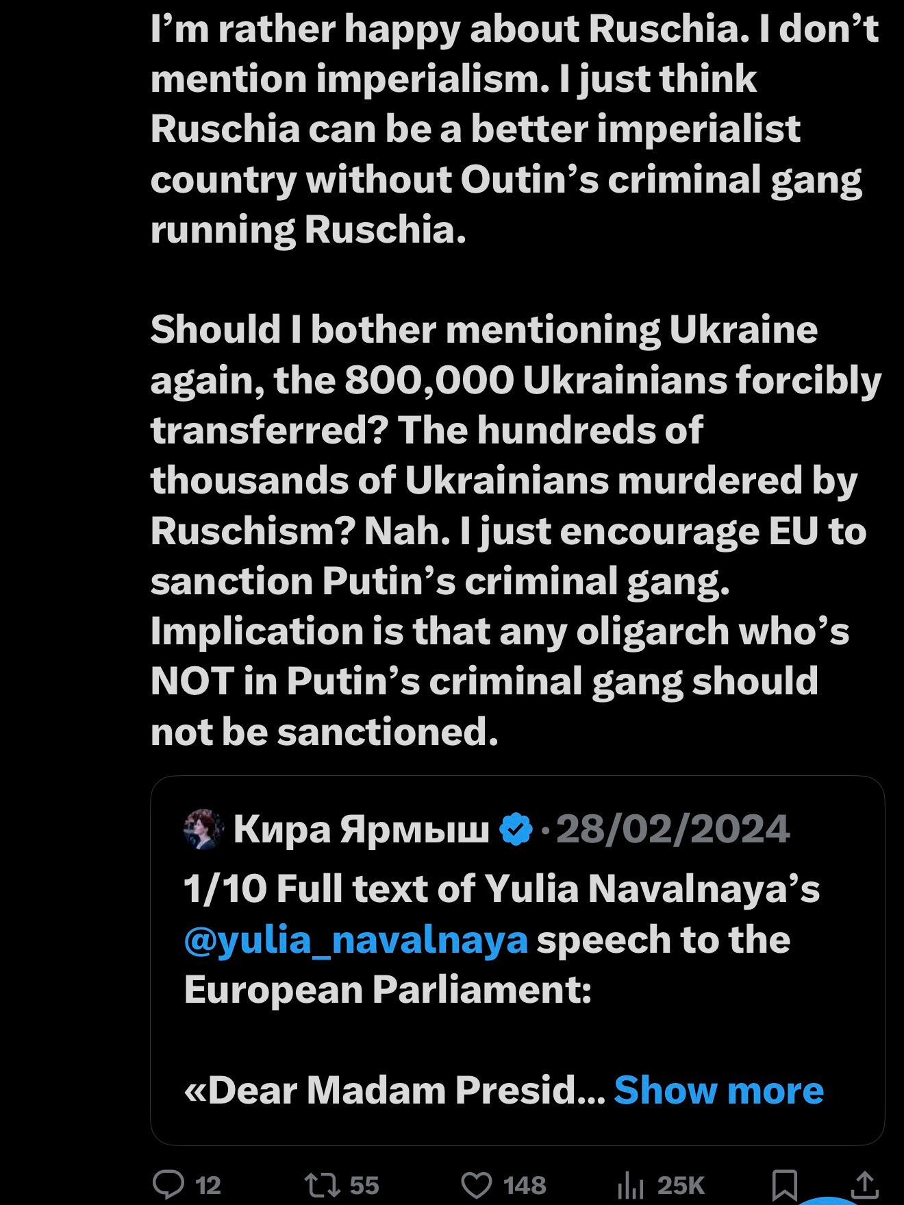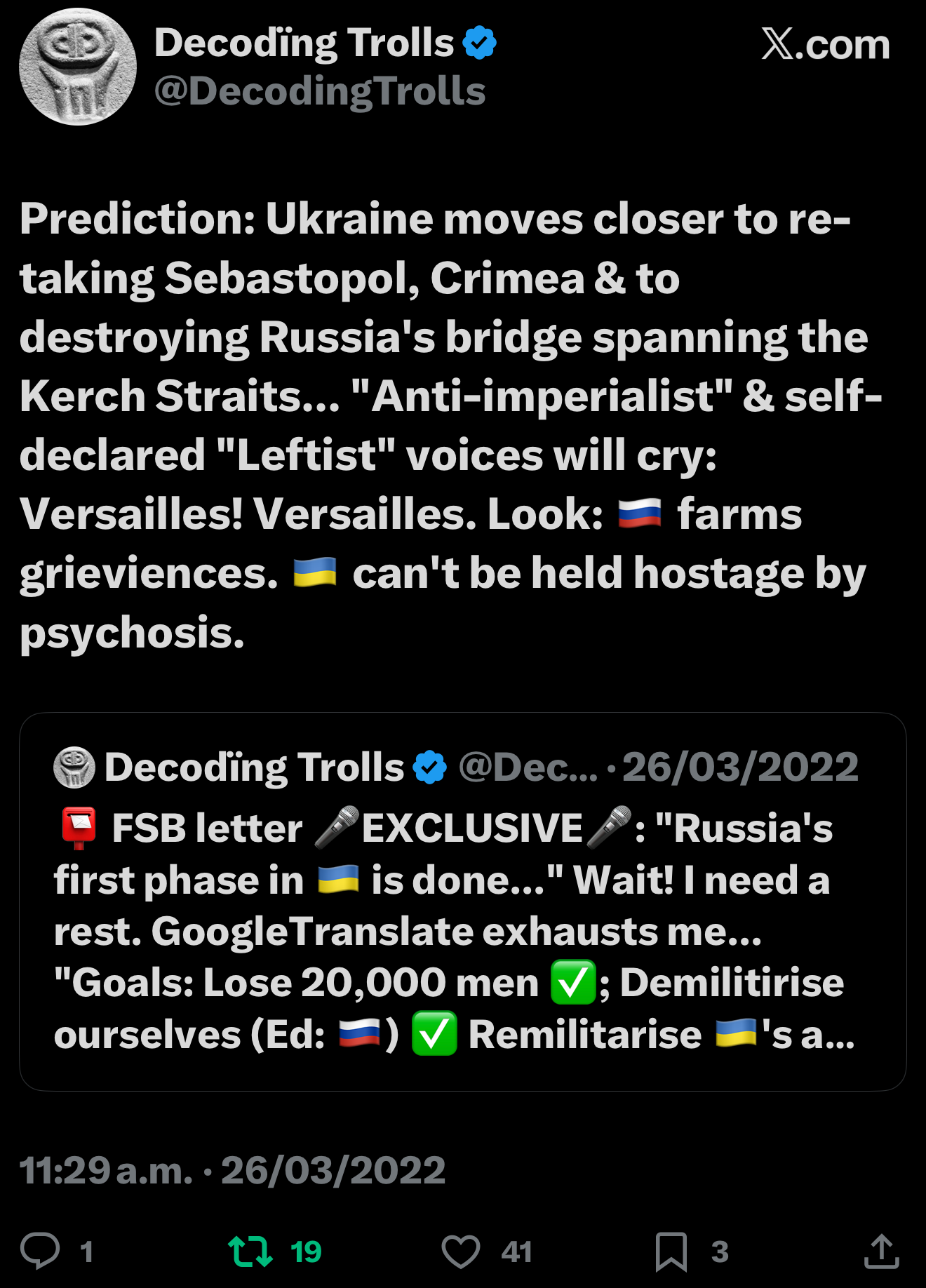 So I discovered the term tanky. Now I recognize the energy / Mana of tankydom in many memes. The Mana of tankydom. When I hear the stock qualifier of an anti-Ukraine positioning attempting to conceal itself -“of course, Putin is a dictator and has done war crimes….” This is exactly the kind of thing we hear when we hear the Russian opposition.