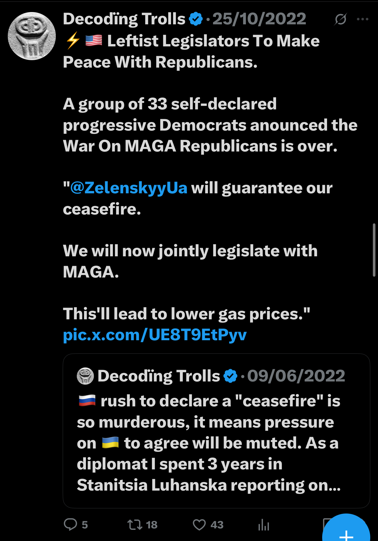 we’re doing when we’re looking at disinformation and propaganda. And I’ll leave it there for now, but just quickly end up with the the idea that which I saw it somewhere else, but I’m quite interested by it, which is just this idea that the left, that Sultana can somehow bring about peace in Ukraine by disarming Ukraine.