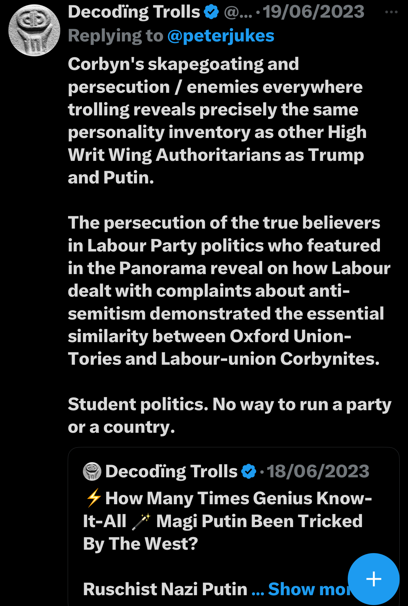 We can smell tankydom because we’ve had so much practice. Our training set is millions of memes that have passed us on the timeline since the 24th. of February 2022. And so that training set has enabled us to scent. And what I’m trying to do with Distant Folklore as an analytical method is to drill