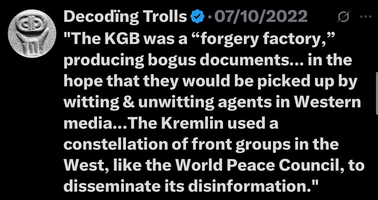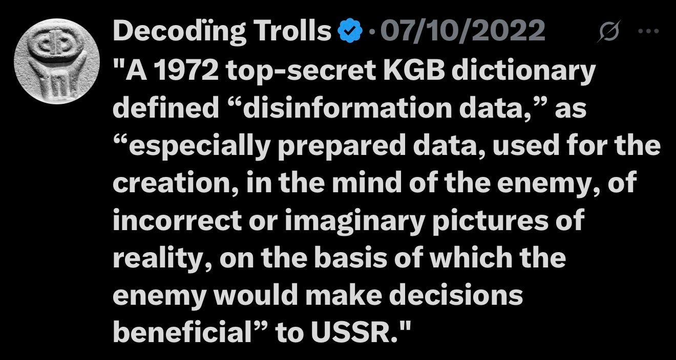 This word disinformation, for instance, Here I’m reading from a text. A 1972 top secret KGB dictionary defined