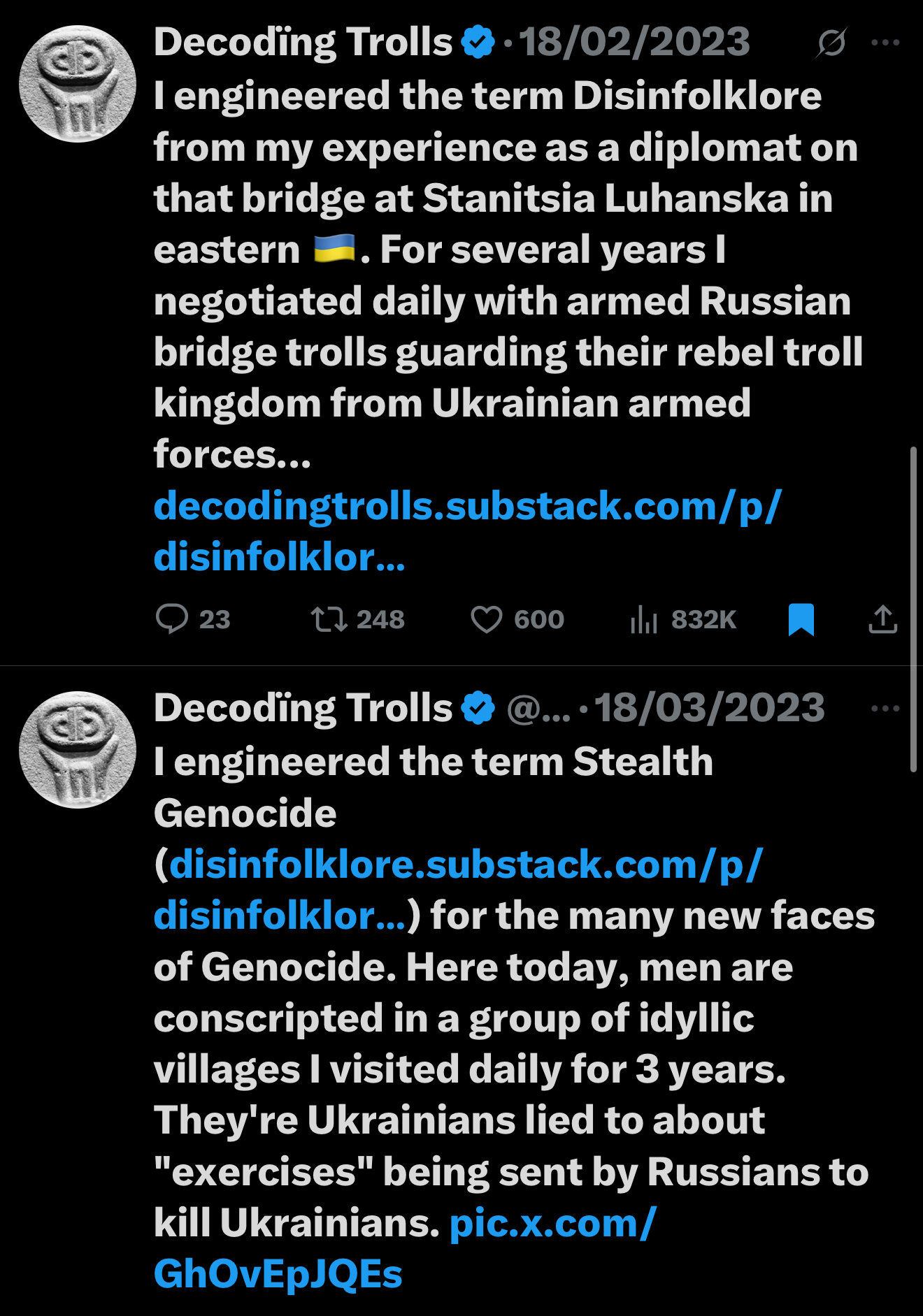 The Disinfolklore moniker emerged when I found that ‘Folklore’ folder. Then I had another folder of disinformation. I was like thinking, I need a new moniker because I’m talking about something that no one really knows about. Not even the people I worked with in eastern Ukraine and Russia-occupied Ukraine recognized what I recognized as something strange, weird, new.