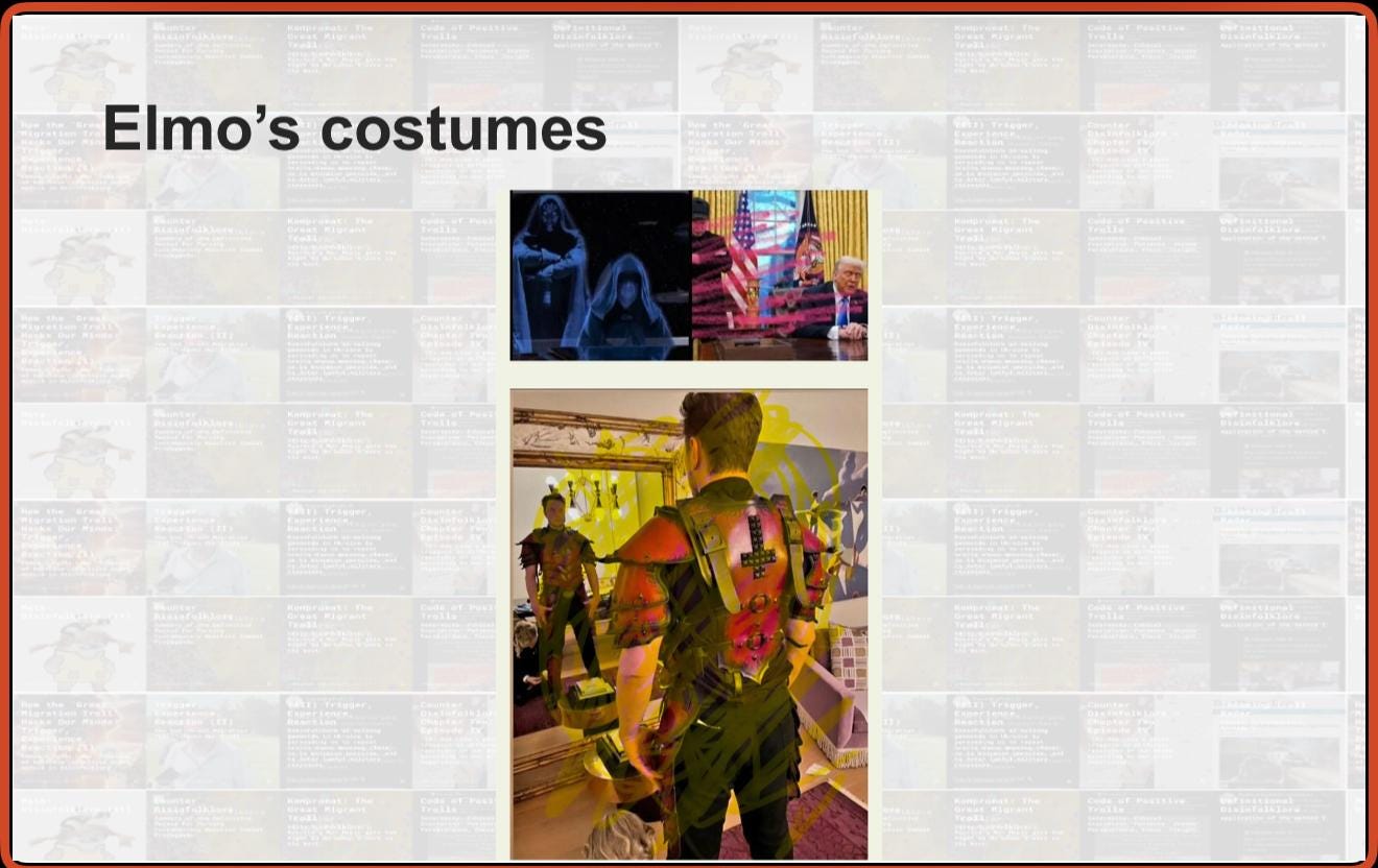 So just kind of odd archetyping of different characters who are part of our lives with these weird powers over us in the information space. uh we we did have elmo robin and druidy don batman they were dressed up in marvel cinematic universe costumes all that black the black coat that elmo was wearing