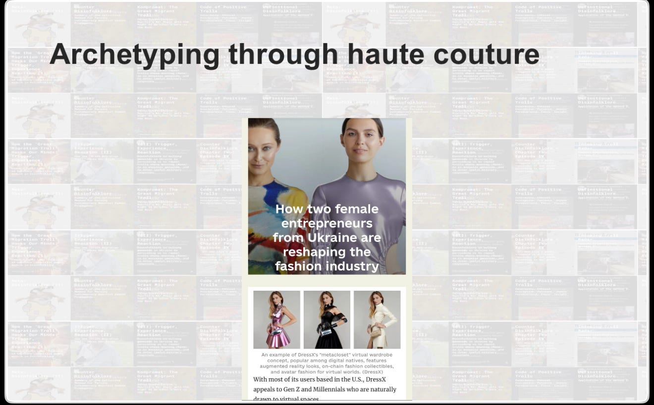 Two Ukrainian fashion designers founded Dress X in Los Angeles. They, like the pirate party and me with distant folklore, noticed the porousness between in real life and memes in our cultural space. Dress X identified a market for real world clothes that mimic and riff off a Marvel or Disney World aesthetic. So archetyping through haute couture.