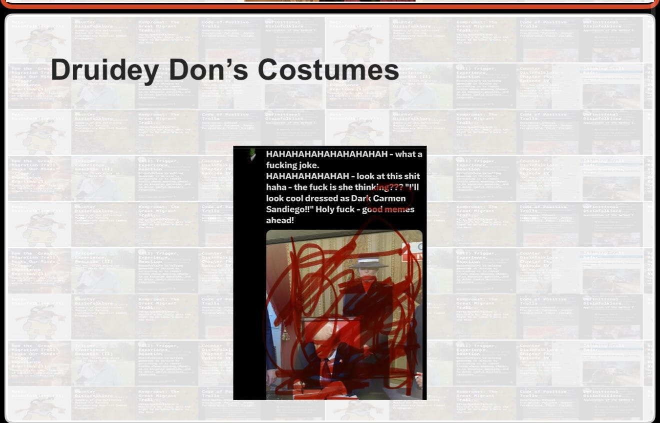 through our own minds working through these memes and those of others influencing us from archetypes created and evolving from distant folklore. So we had all of the archetyping of Elmo and Druidy Don in the White House that day, those days in January. and the totality of our infospace was occupied by memes like the Department of Government Efficiency,