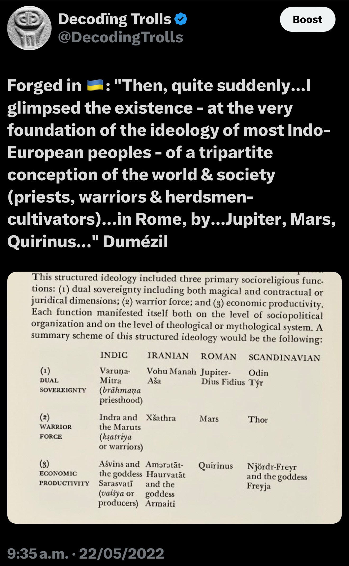 It is not enough to defend sovereignty alone because the three archetypes which are central to Indo-European communities since the time of the Yamnaya are: Sovereignty, Security, and Prosperity (or Fertility).