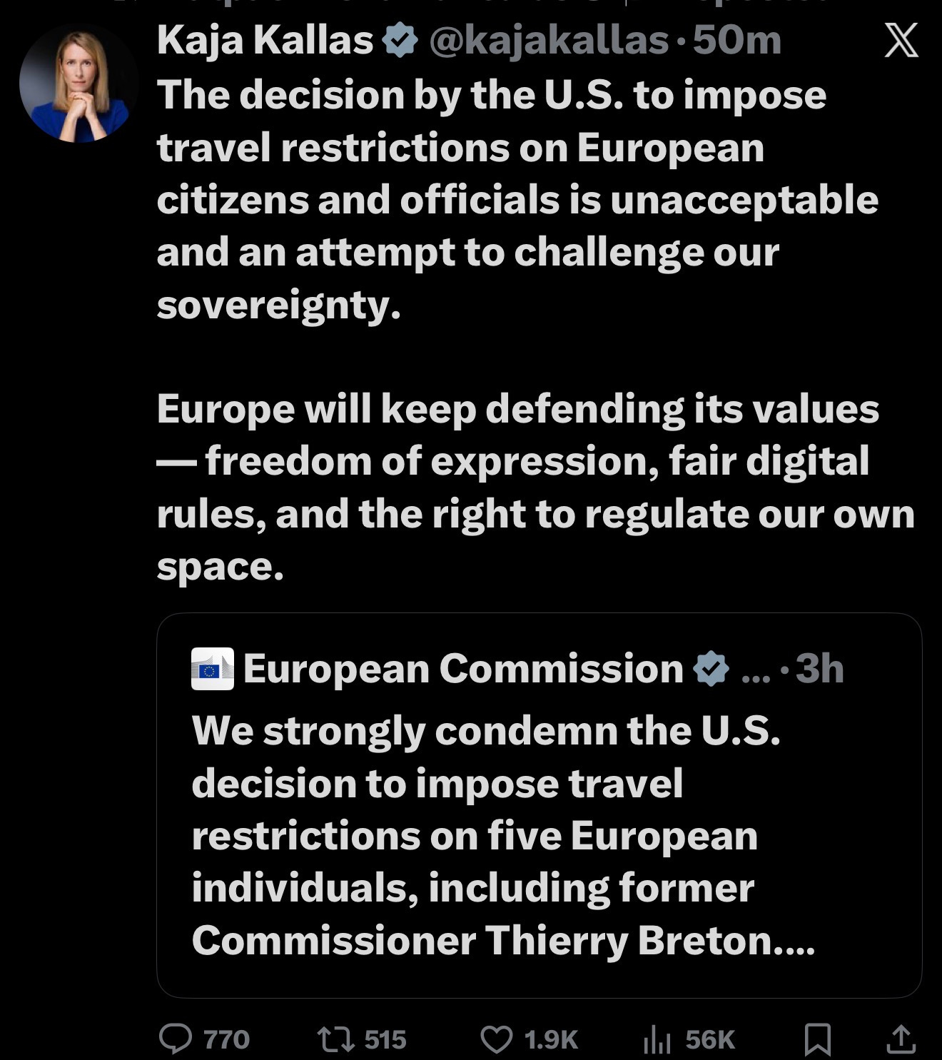 The words from the United States Vice President at that conference are continuing to resonate, with new policies being released all the time. Most recently, the attempt to sanction the European Union—specifically several former senior European Union officials—for so-called free speech crimes.