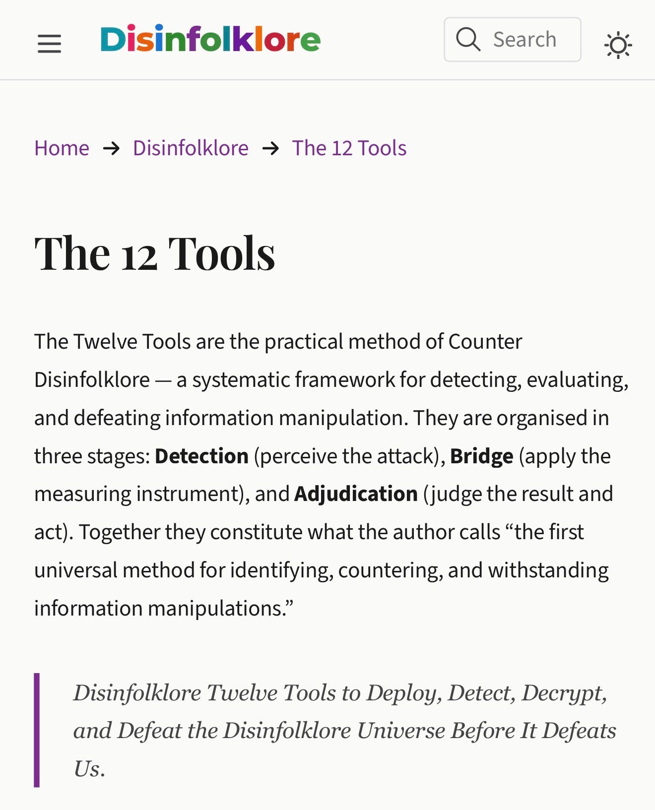 I have developed the Twelve-Tool way to decode — as I’m now archetyping it — to decode and counter Disinfolklore. The first six tools are on disinfolklore.eu and disinfolklore.com. The first six tools are for detection and decryption: Archetypal Disinfolklore Literacy; Incoming and Outgoing Troll Radars; Look for the Mana in the Meme; Inner and Outer Realm Imminences; Trigger, Experience, Reaction — the Dalai Lama/Paul Ekman Timeline of Emotions model; and the Code of Positive Trolls.