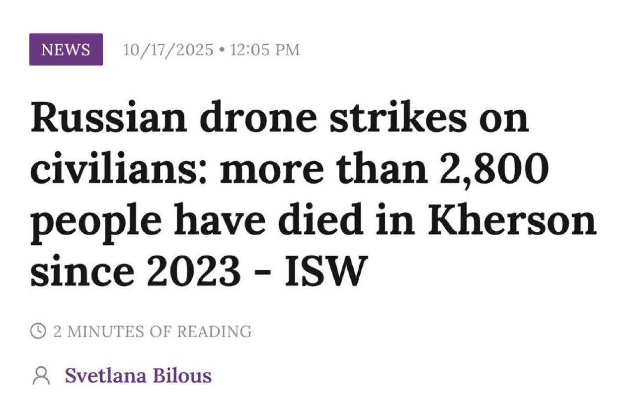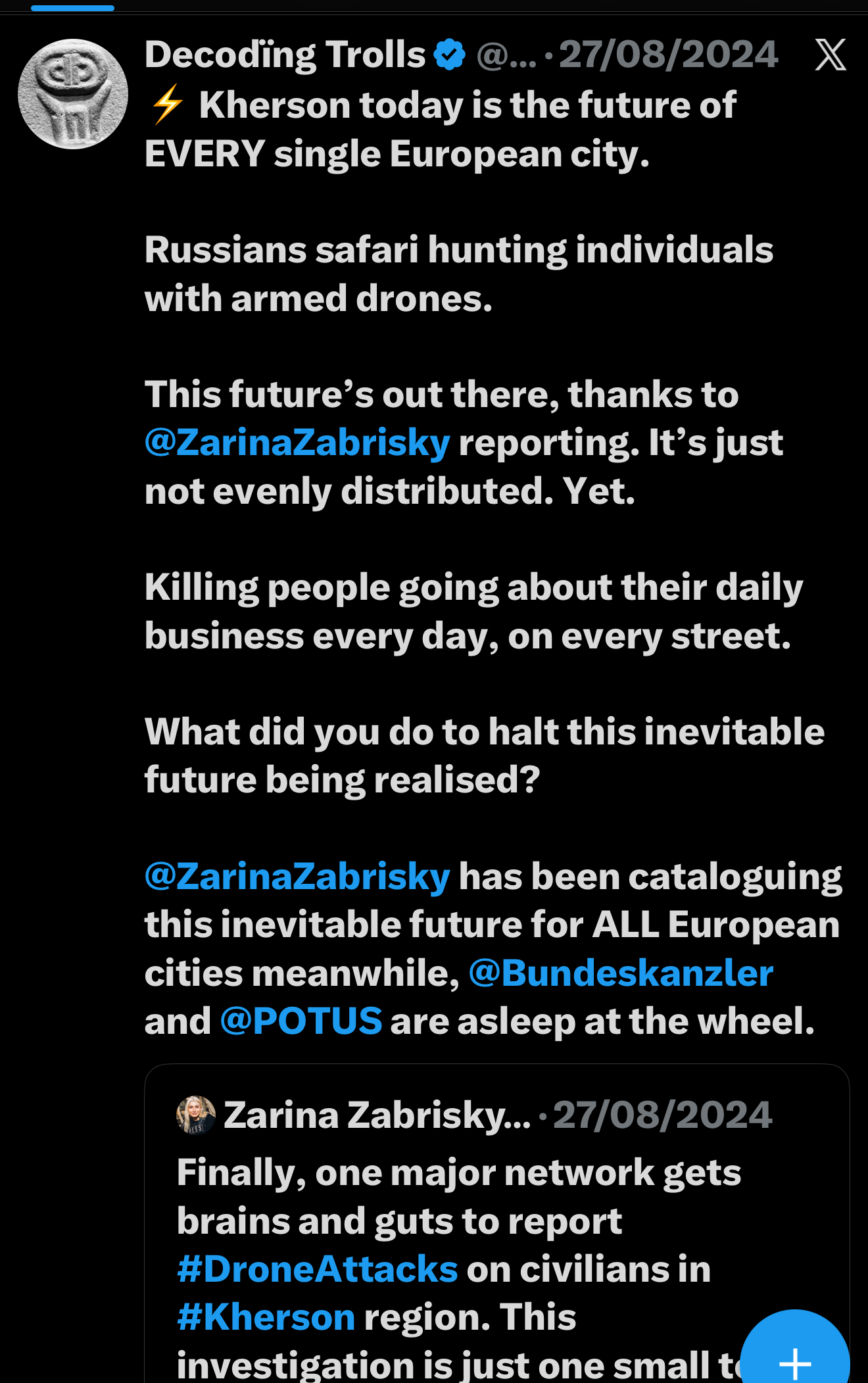 The UN Commission of Inquiry based in Vienna has issued a report on the human safaris in Kherson that all of us are aware of, which have been going on since July 2024, and it has established that these are crimes against humanity. And part of the the indictment of Russia and those participating in the prosecution of these crimes against humanity, interesting to use the word prosecution there, is that Russia, the Russian state is sharing these videos of their human safaris of the 140 people they’ve murdered using first-person view drones. The commission of inquiry determines that because they are first-person view drones, the operators of these drones are hunting individuals, chasing them,