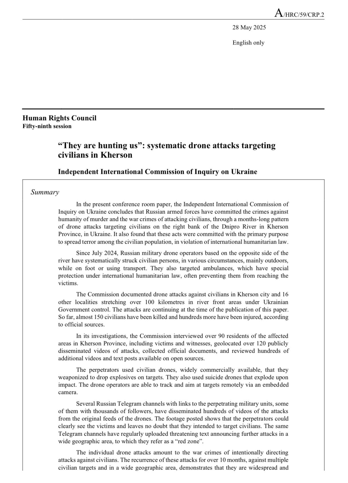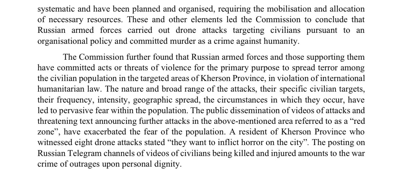 After detailed investigations into 200 of the 2,800 murders of civilians by Russia using First Person View drones in Kherson, the UN Commission of Inquiry has determined these are Crimes Against Humanity.