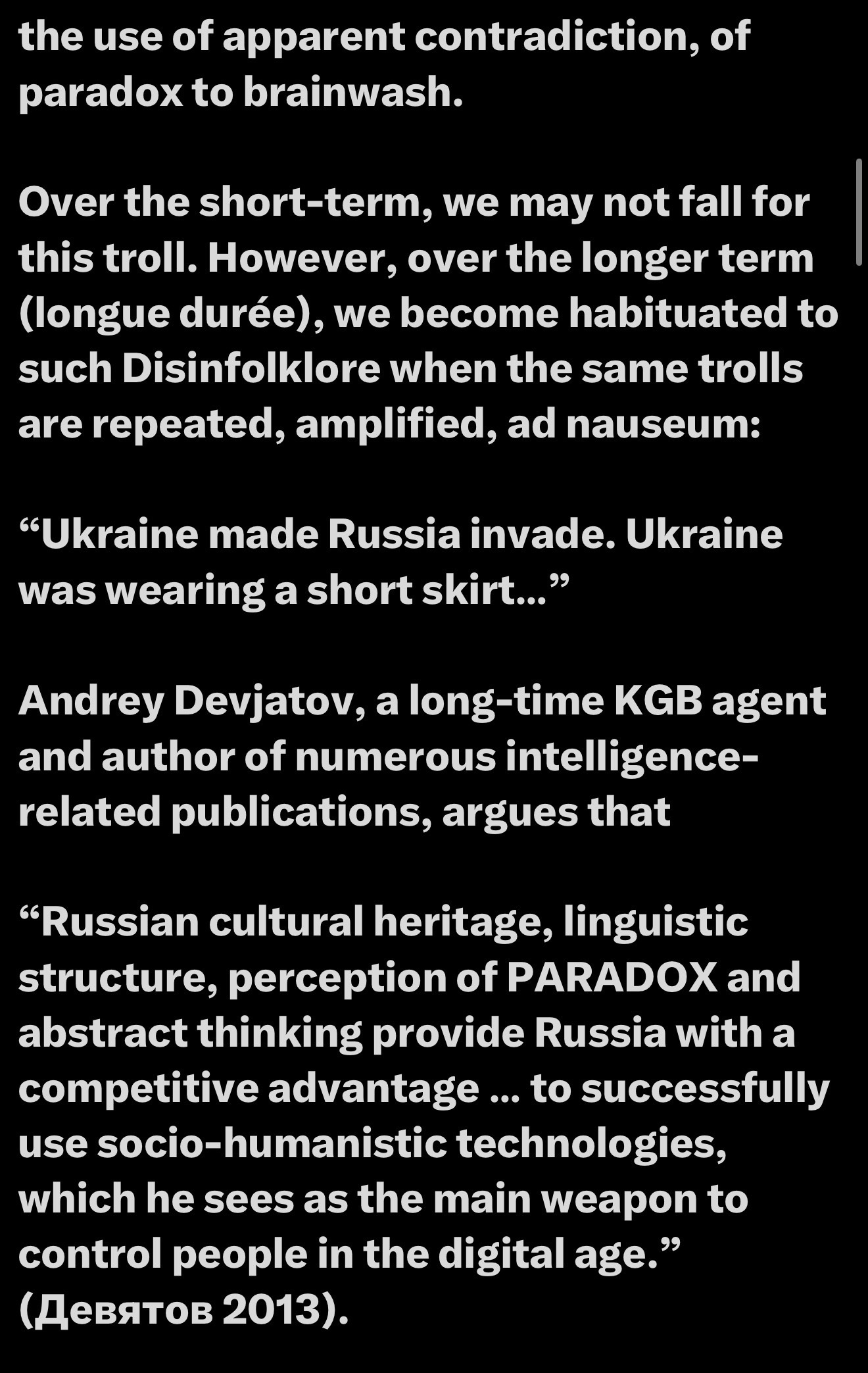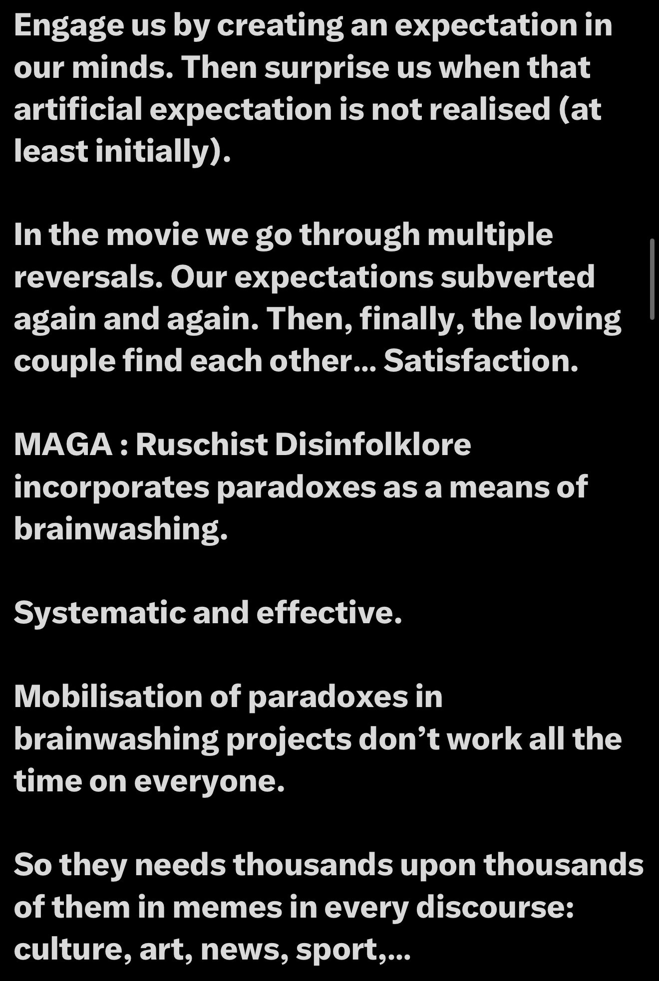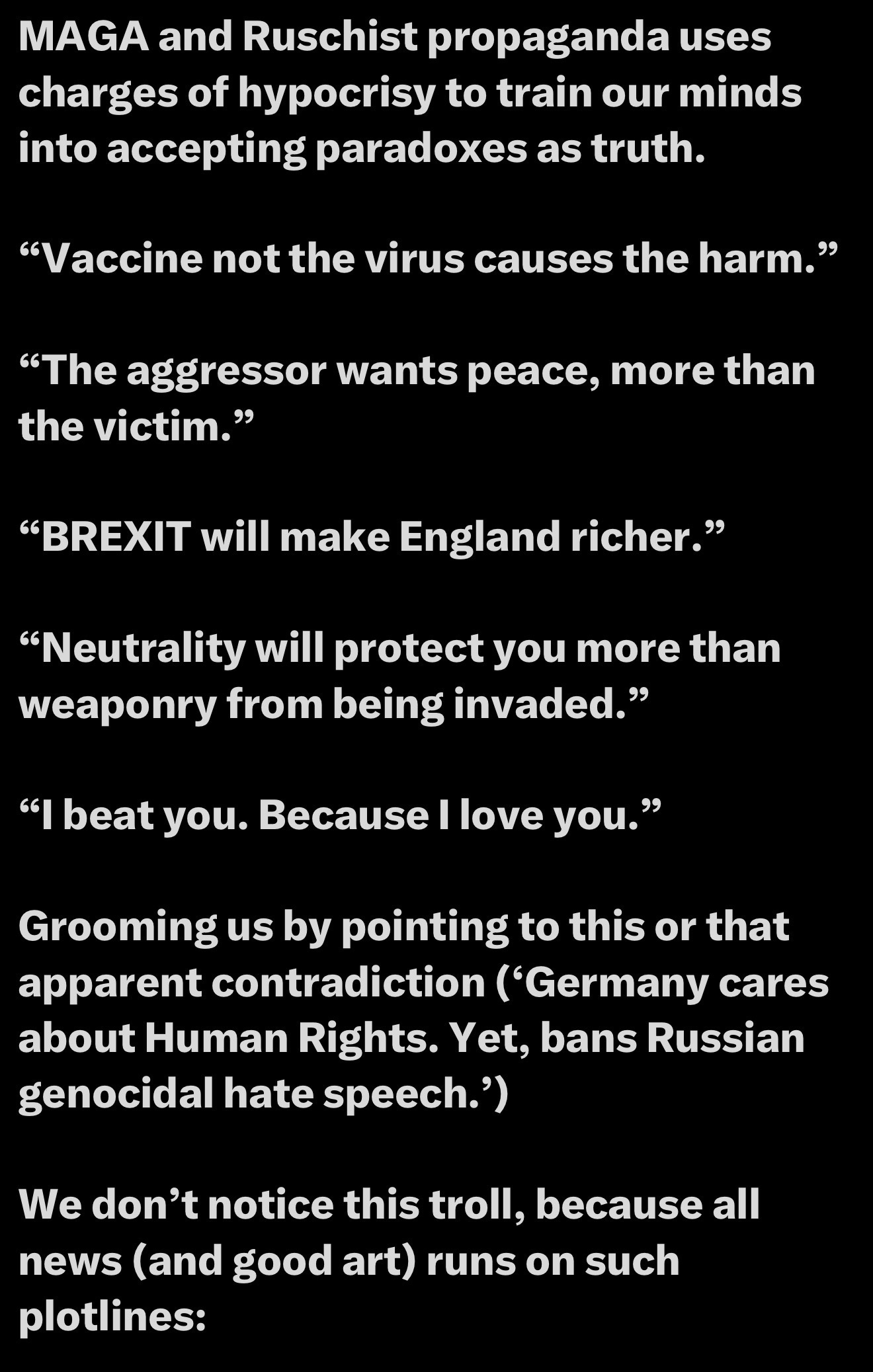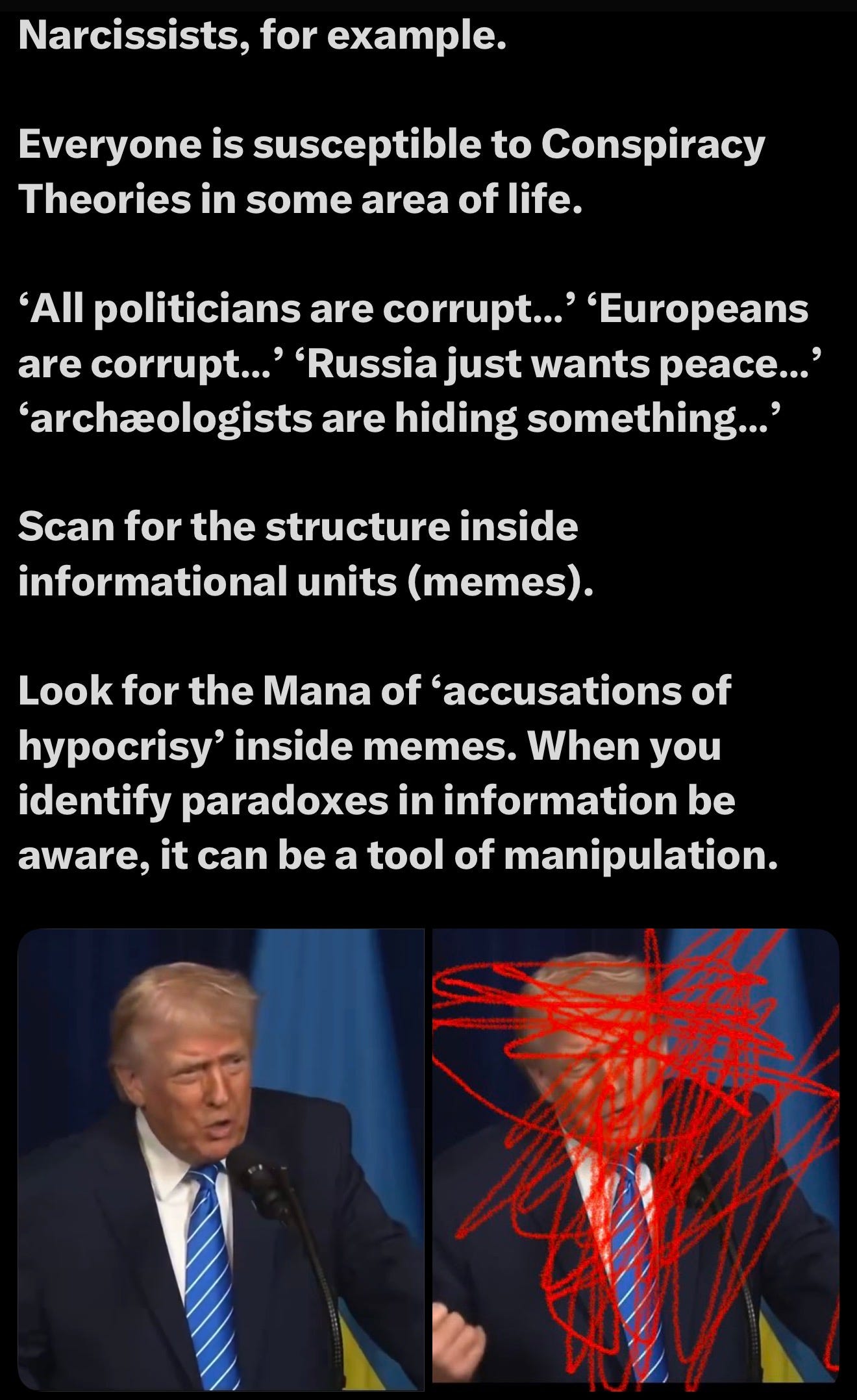 These hypocrisies and paradoxes are pointed out in statements like “European politicians care about human rights, but look at us, they won’t let Russian newspapers in.” It’s hypocrisy. Once you notice this, you see it everywhere. Many people do it out of habit, without thinking it through. I’m making a plea to pay attention to these paradoxes and avoid them unless they’re truly interesting. They have brainwashing effects. All politicians are corrupt, Europeans are corrupt, Russia just wants peace. If we can scan for paradoxes and contradictions inside memes, it becomes a valuable discipline, helping us interpret data more insightfully.