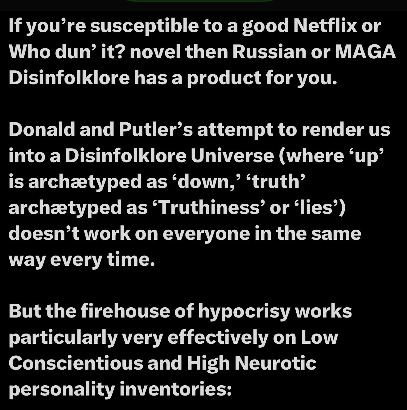 People voted for MAGA for no more wars, yet now are excited about war. This is the Disinfolklore universe. One story isn’t enough to change identity, but a series of stories can. It’s crucial to understand how Disinfolklore changes identities and how it affects others.