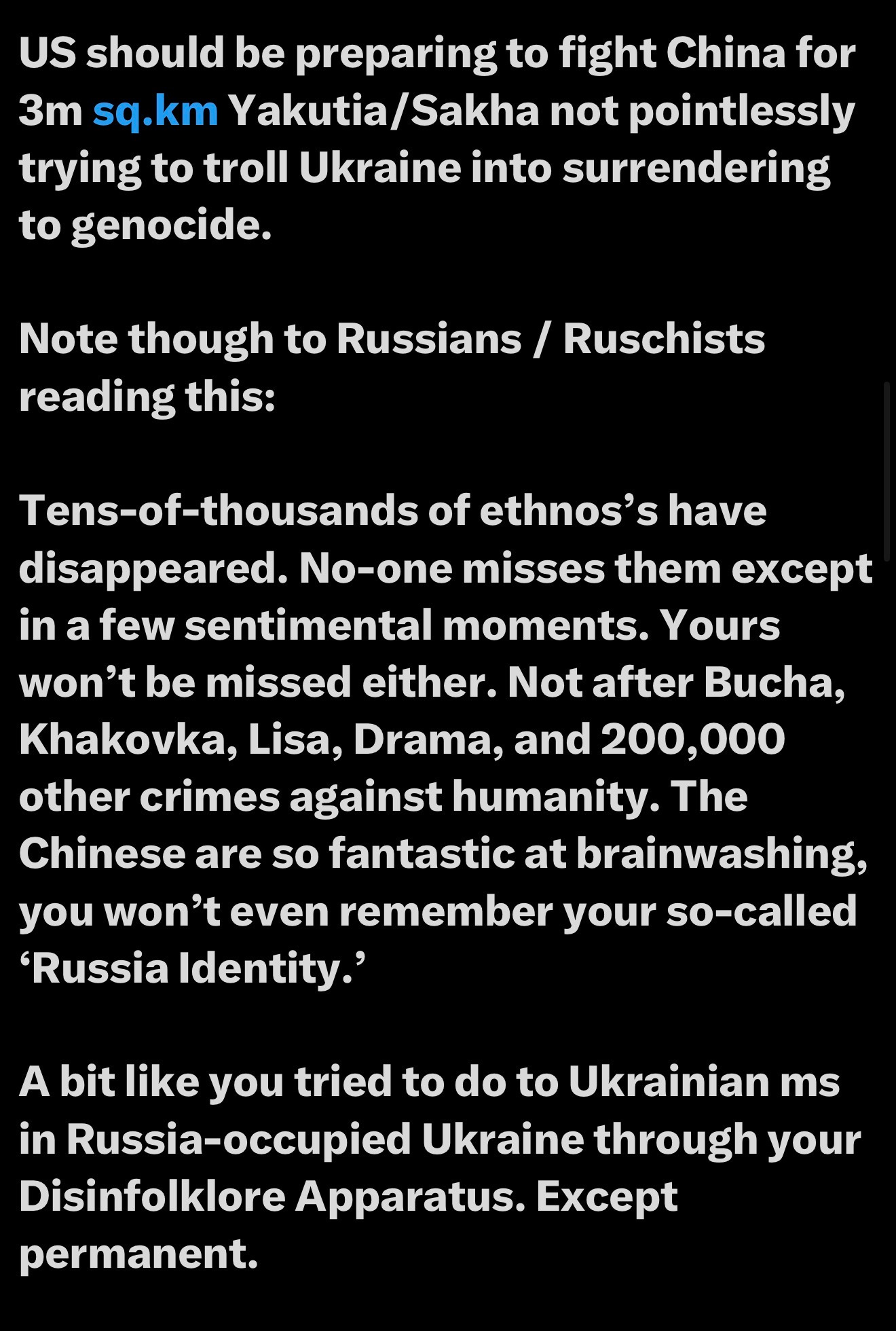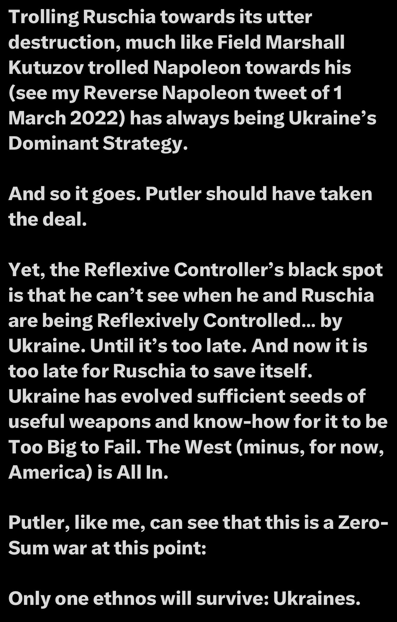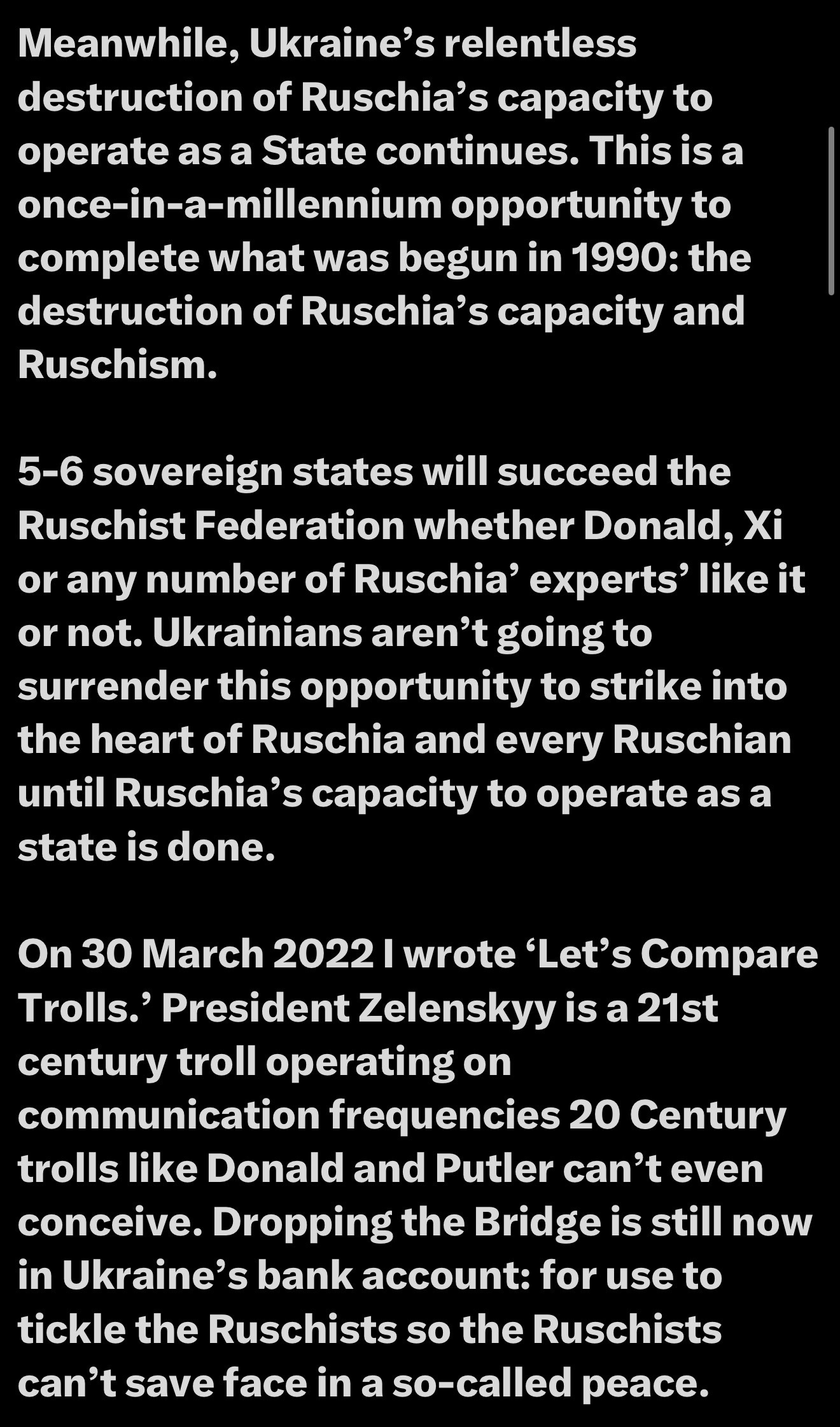 Ukraine’s relentless destruction of Russia’s capacity continues. It’s a once-in-a-millennium opportunity to complete what began in 1990, with the destruction of Russia’s capacity. Five to six sovereign states will succeed the Russian Federation, whether Donald or others like it or not.