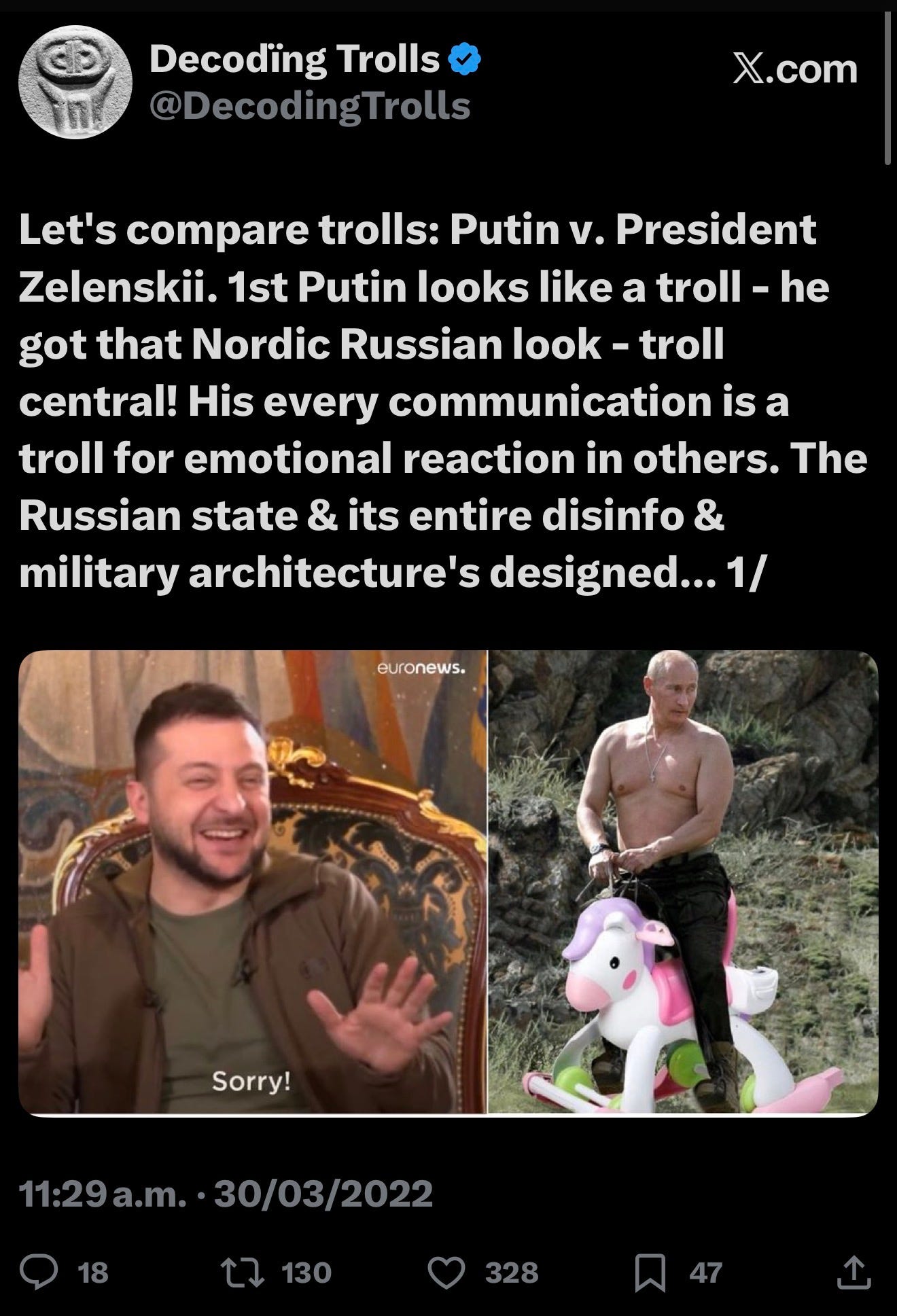 President Zelensky is a 21st-century troll, operating on frequencies 20th-century trolls like Donald and Putla can’t conceive. His ability to move emotions with a facial expression is remarkable. He maintains integrity, ensuring that Ukrainians understand he doesn’t subscribe to the idea that Putla wants Ukraine to succeed.