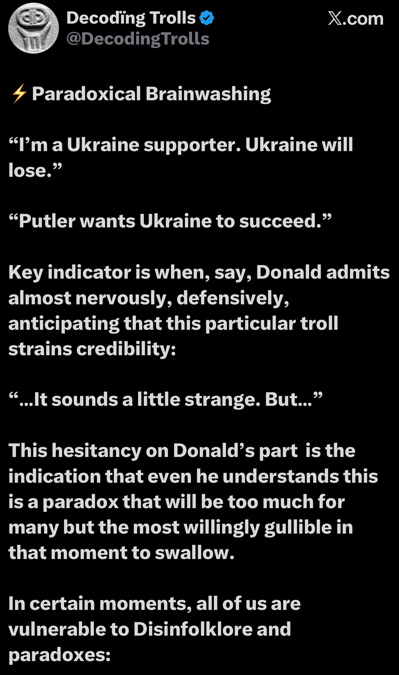 The paradox extends to statements like “Putler wants Ukraine to succeed,” even while bombing Ukraine. These contradictions are part of cult formation and brainwashing, not just rhetorical ticks but powerful weapons. The hesitancy in such statements indicates an understanding of their paradoxical nature, yet they are swallowed by the gullible.