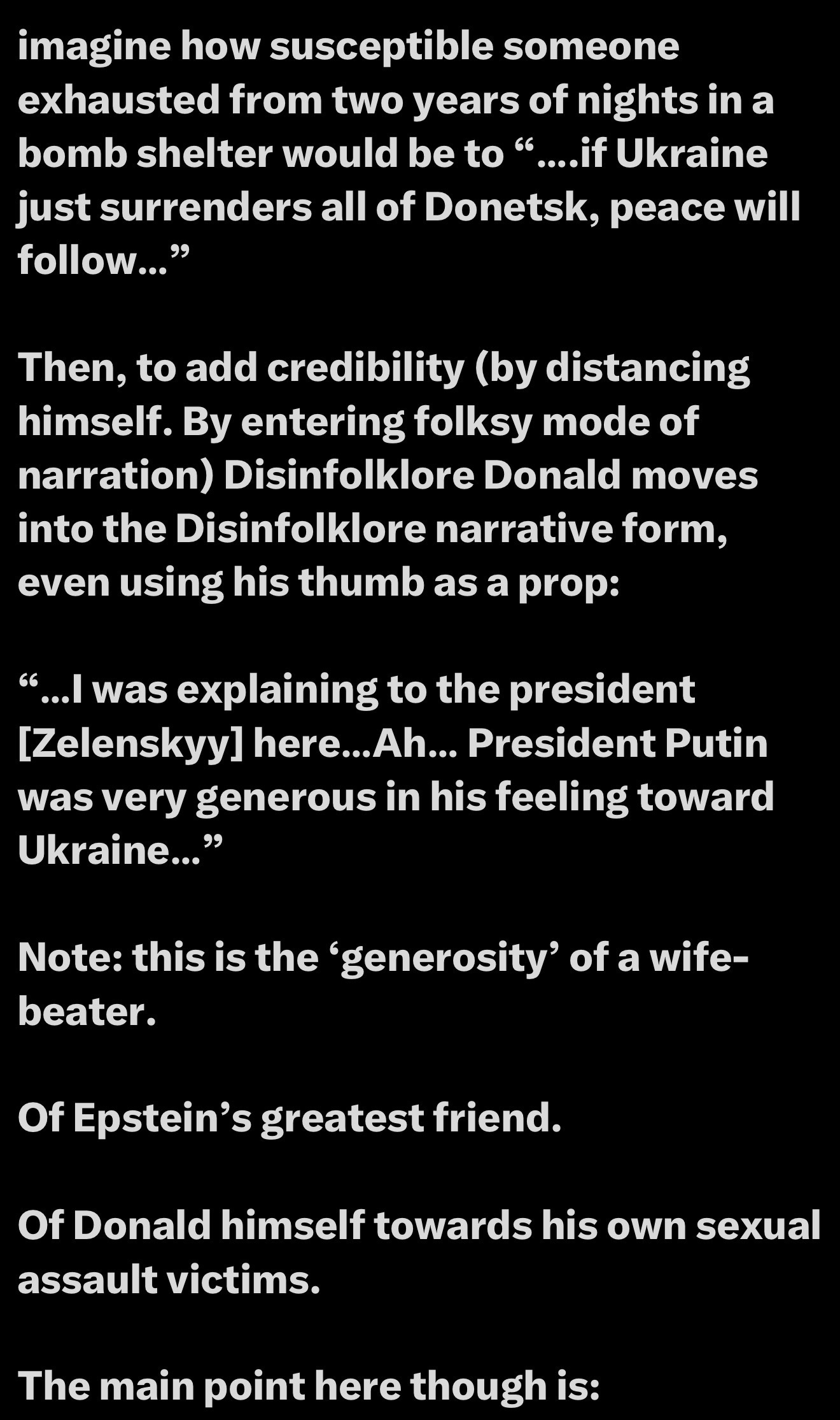 Imagine someone exhausted from two years in a bomb shelter in Ukraine, susceptible to the paradox of surrendering for peace. The generosity Donald spoke of is like that of a wife-beater, using apparent contradictions to brainwash and soothe. Over time, we become habituated to these contradictions.