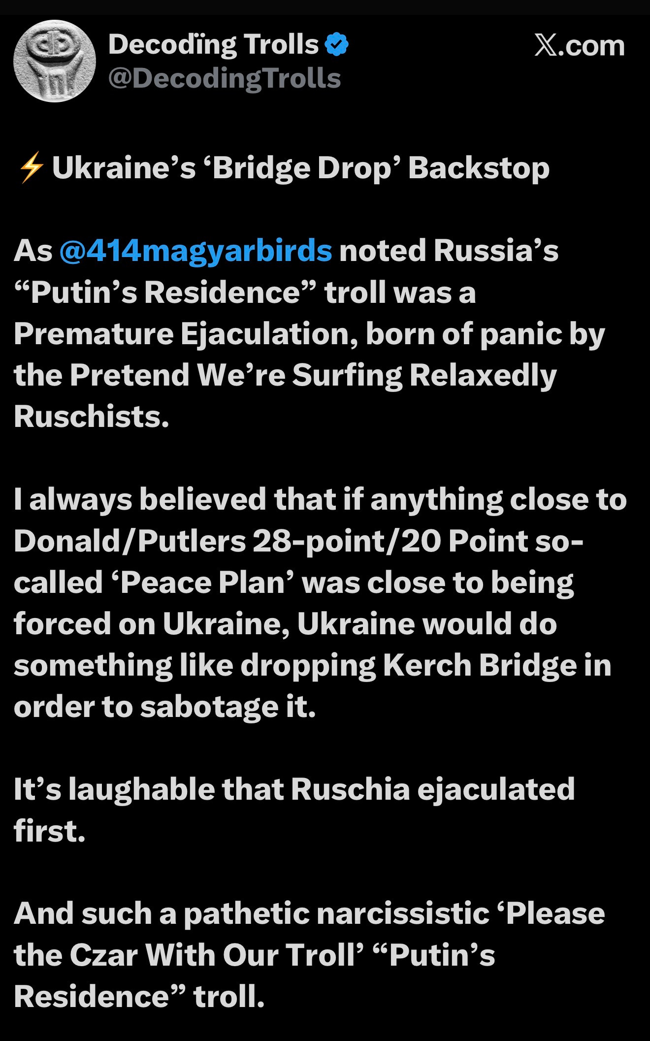 Another idea I’ve had is the Ukraine bridge drop backstop. Putin’s residence troll was a premature ejaculation, born of panic. The Russians sabotaged the peace process, fearing it was moving too fast. The premature aspect was brilliant, as it preempted Ukraine’s potential sabotage.