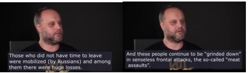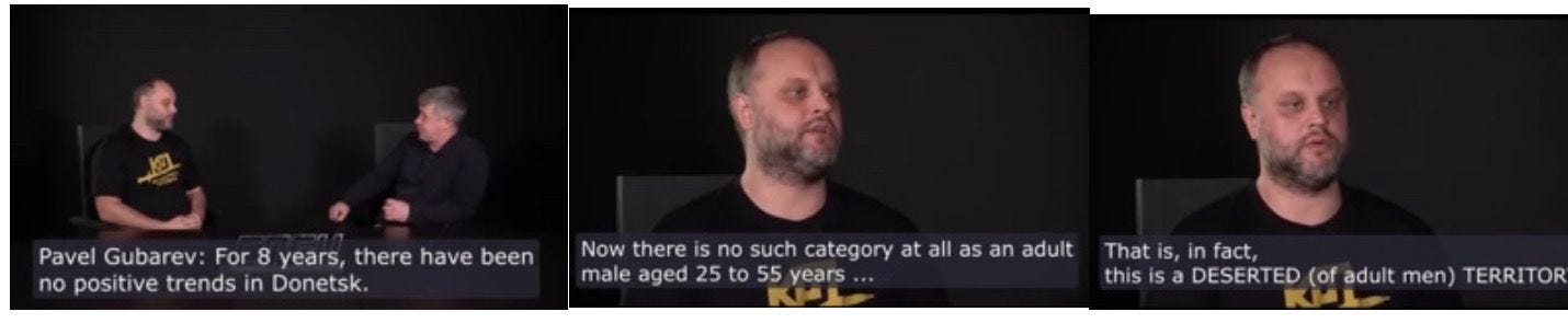 “Now there is no such category at all as an adult male aged twenty-five to fifty-five years… That is, in fact, Donetsk is a deserted (of adult men) territory. Those who did not have time to leave were mobilized by Russians and among them were huge losses. And these people continue to be ‘mowed down’ in senseless frontal attacks, the so-called ‘meat assaults’.”