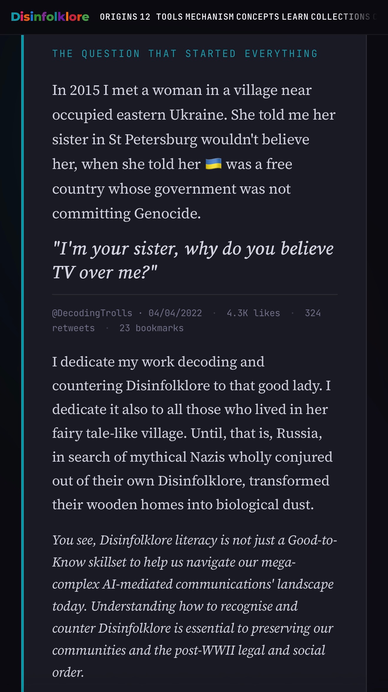 Sometimes it’s a Russian disinfolklorist designing a meme to hack our rational thought systems, to bypass our incoming and outgoing troll radars — which clearly this has, for most of us who are affected by this piece of news. Other times it can be our newly indoctrinated MAGA family member or a trusted news source like the Kyiv Independent, conveying the meme into our minds, unconsciously furthering the disinfolklore galaxy’s designers’ ends. Often we ourselves are unknowingly communicating onwards disinfolklore.
